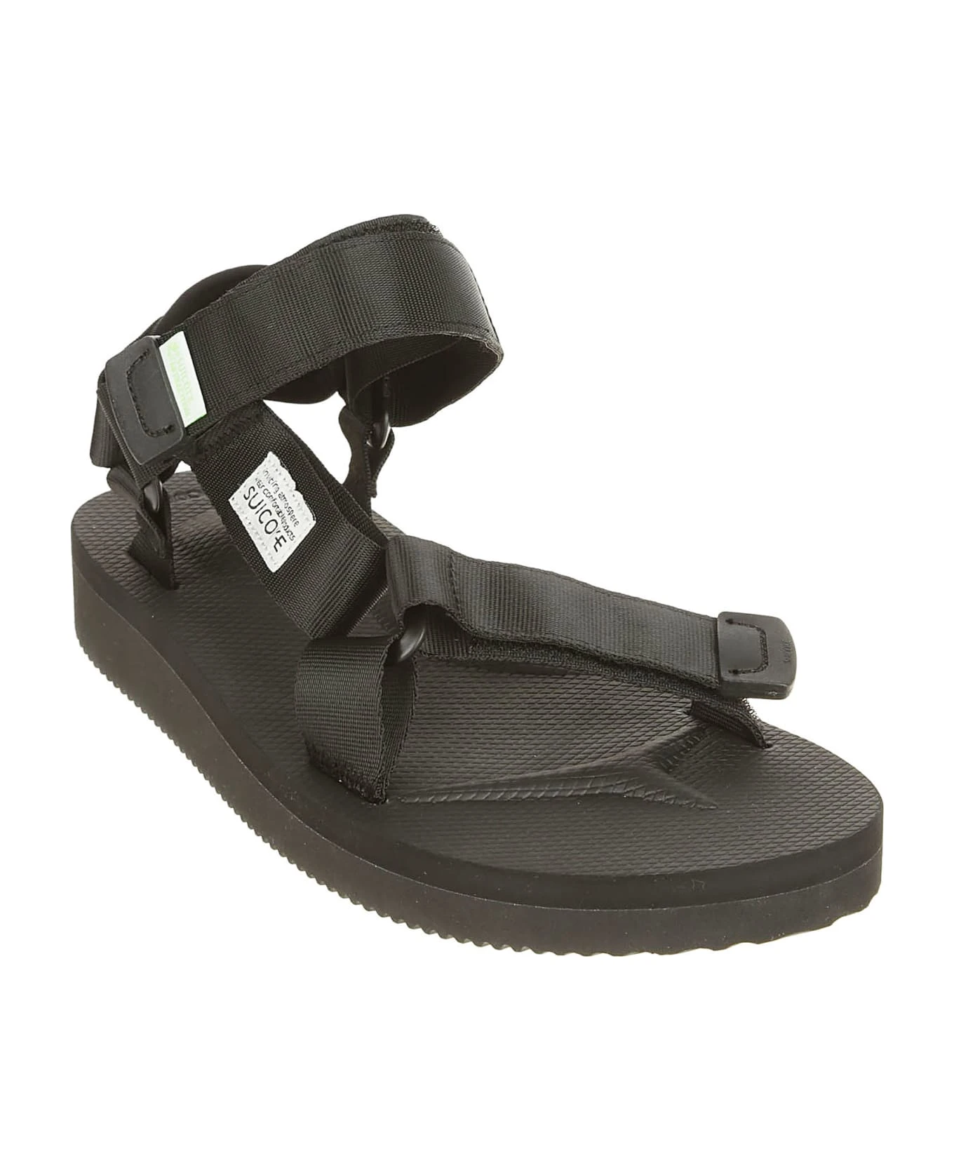Suicoke Black nylon slipper, adjustable closure, logo insert, rubber sole.