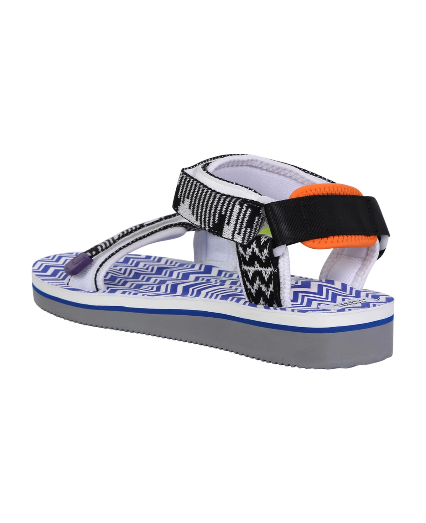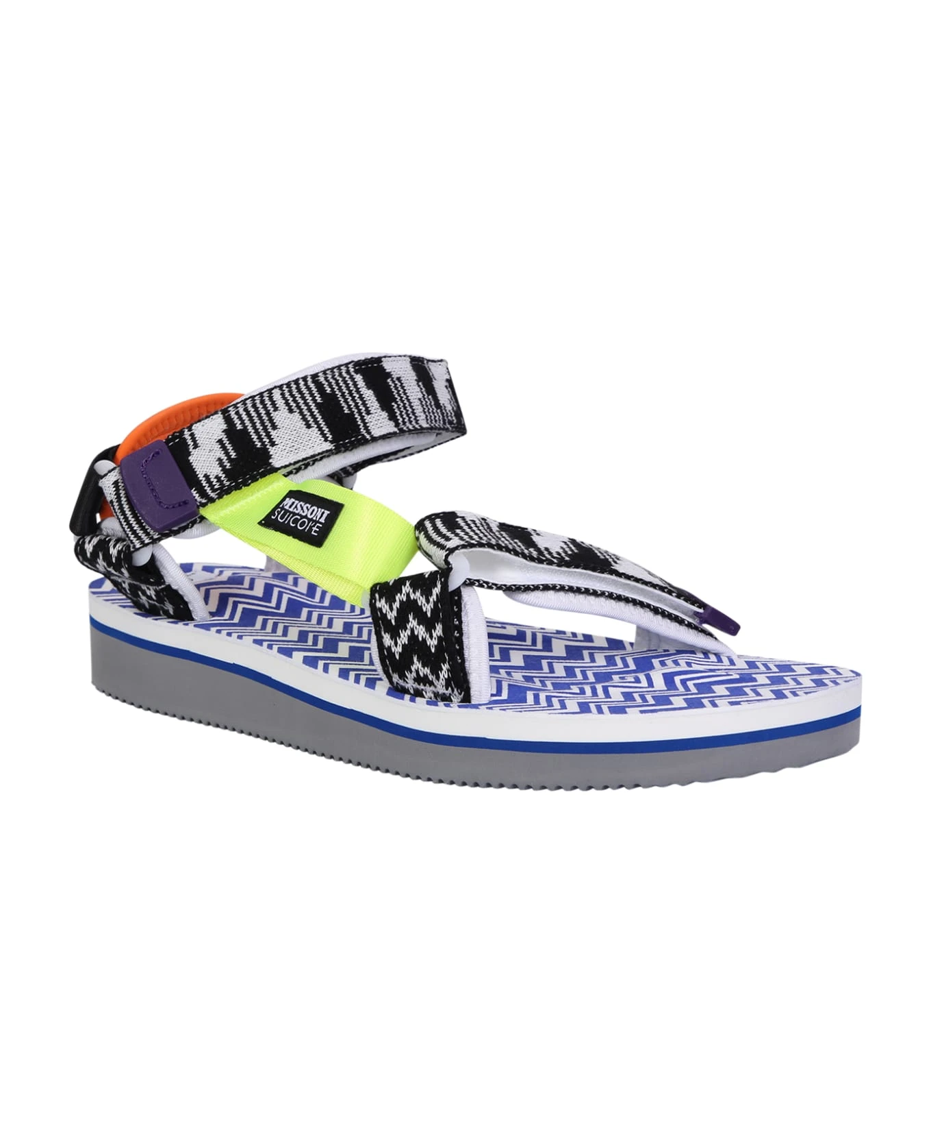 Round toe. Open toe. Touch strap fastening. Signature zigzag woven desing. Zigzag print. Logo patch to the side. Flat rubber sole. Color: blue/ white/ multicolor