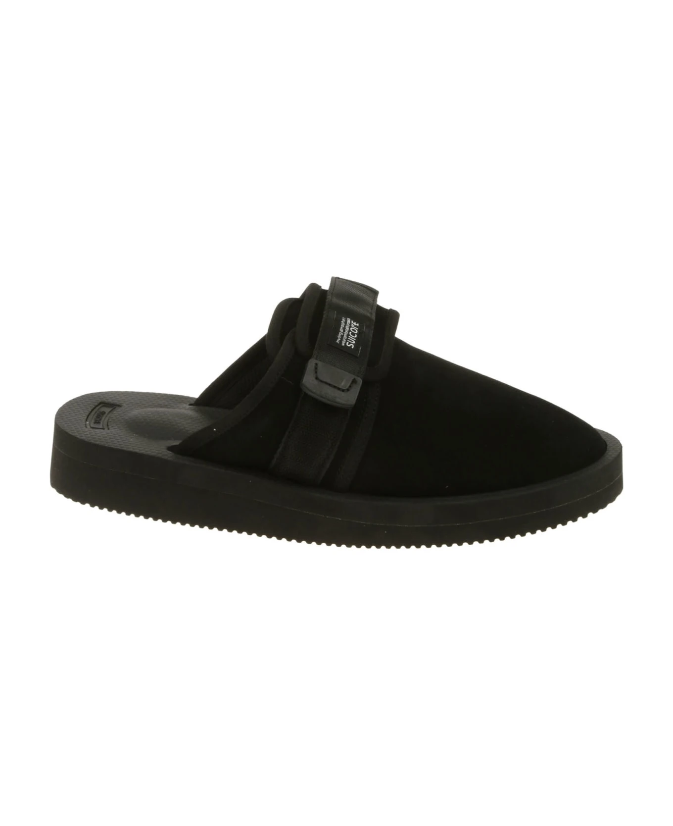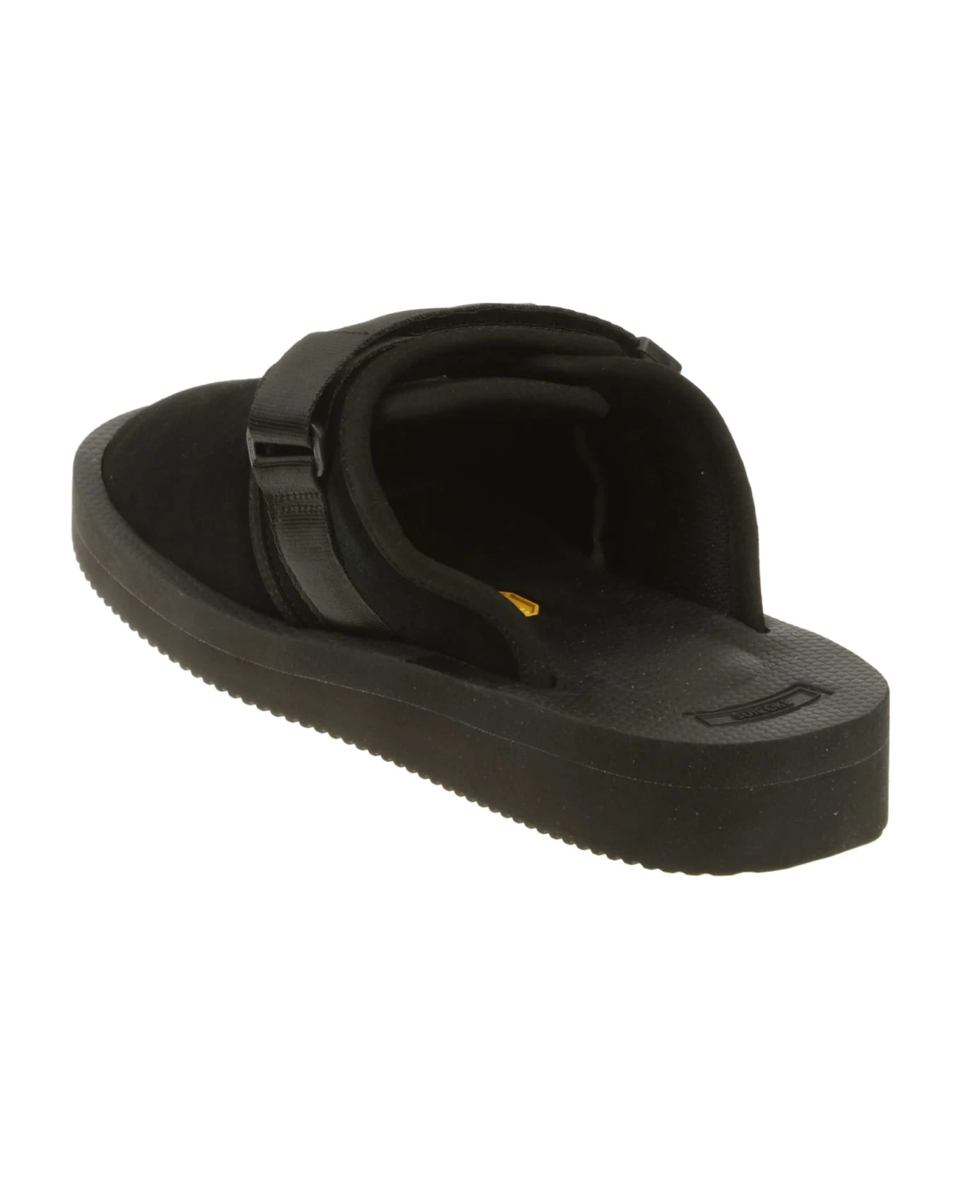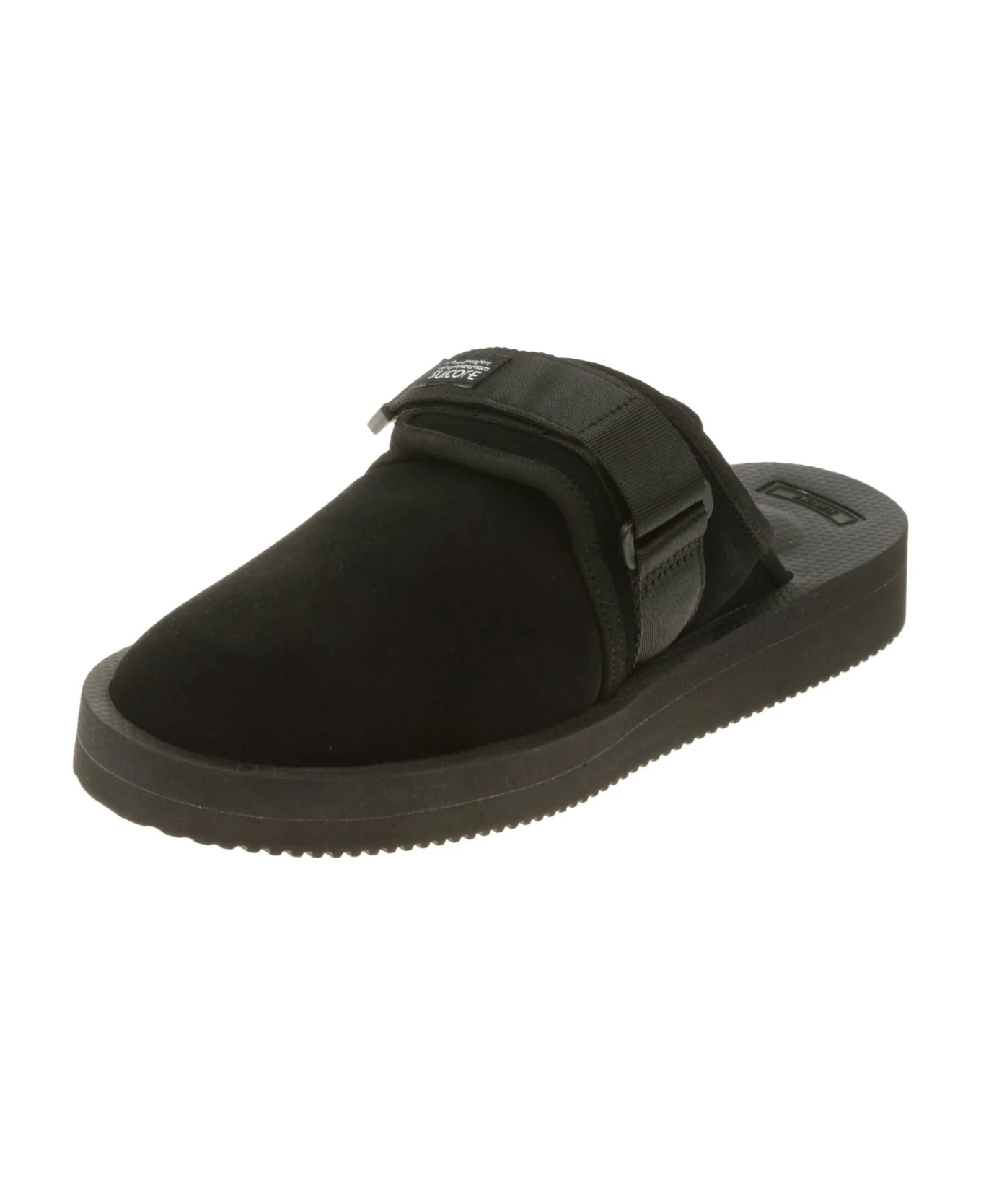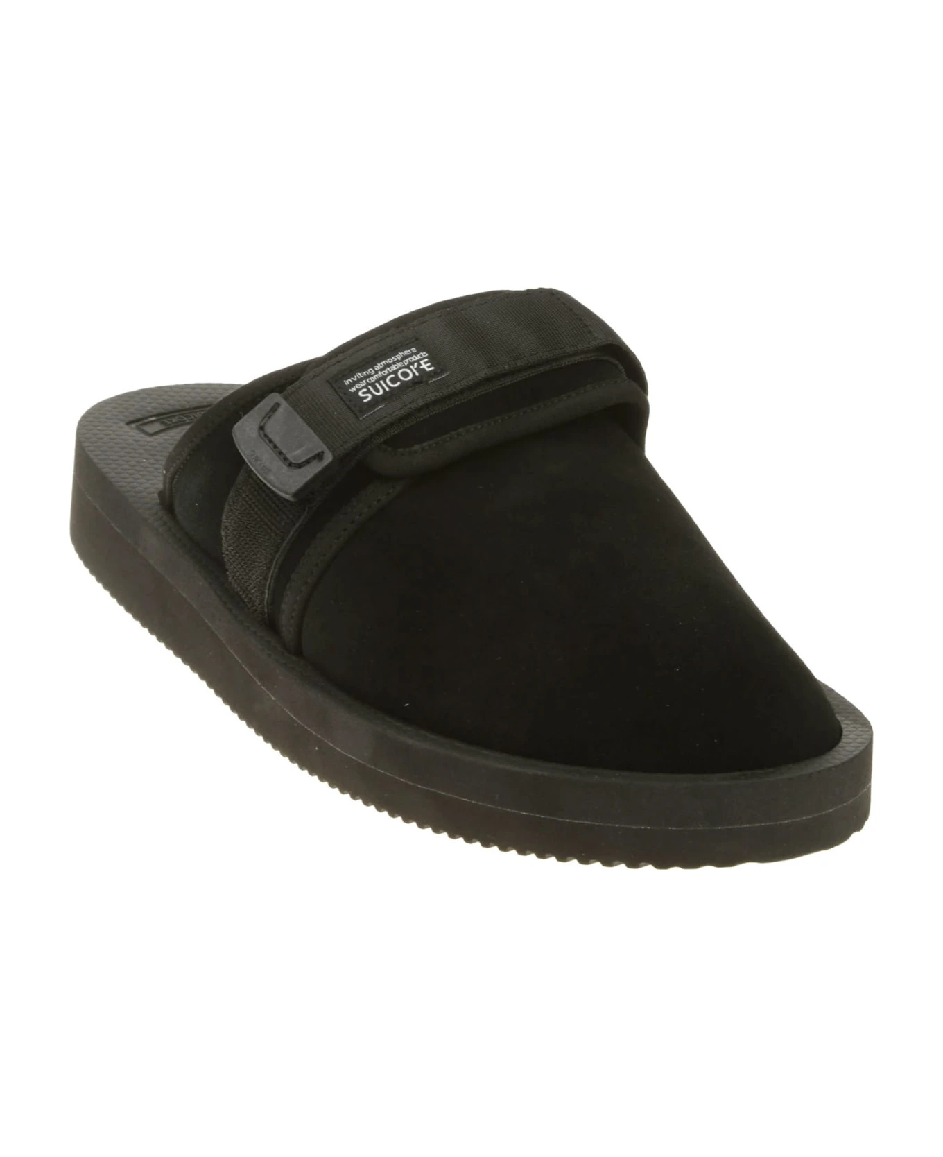Suicoke Black suede slipper, nylon inserts, rubber sole, velcro closure, logo detail.