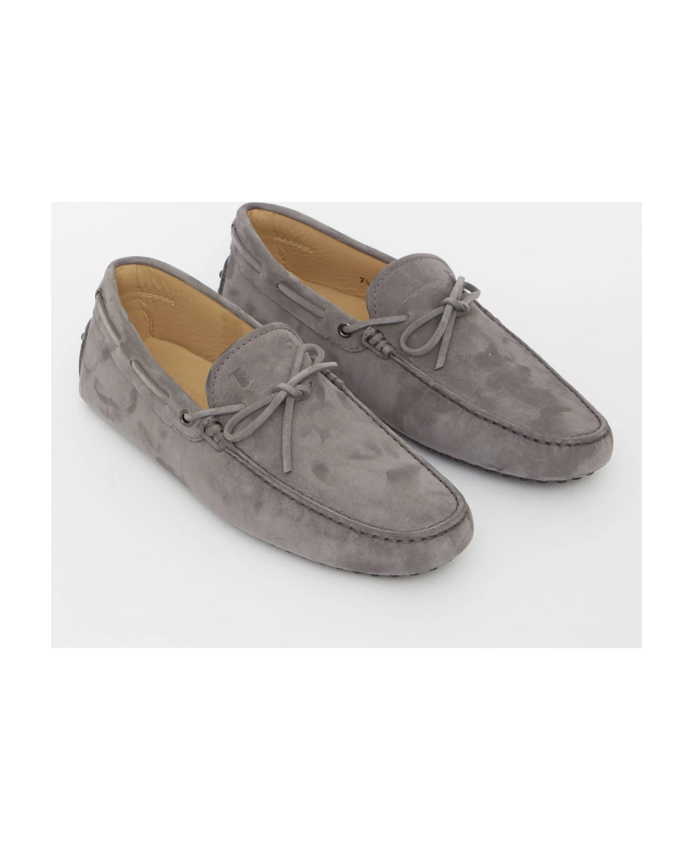 Gommino loafers in grey velvet suede with exposed hand stitching, hot-stamped monogram, front tie and iconic rubber pebble outsole.