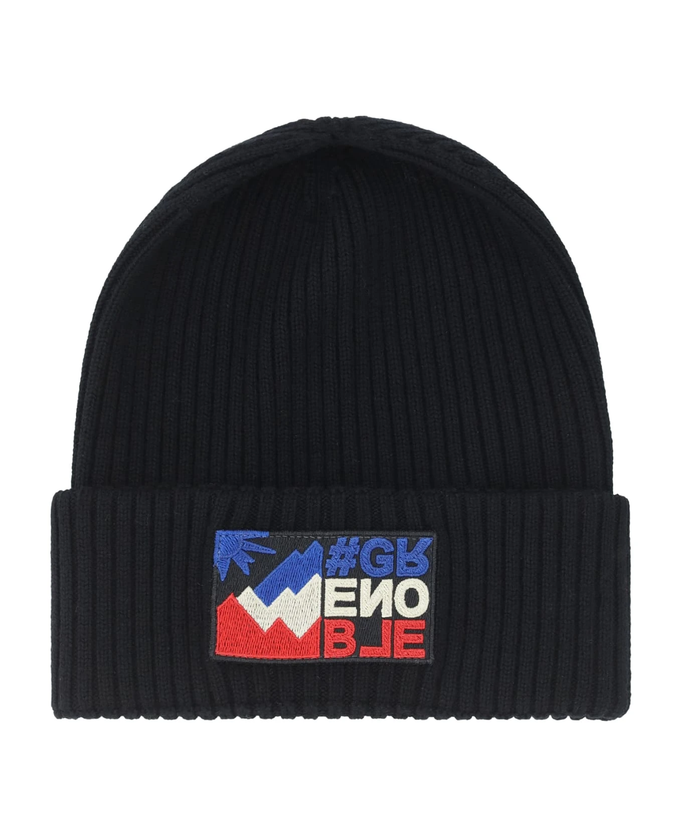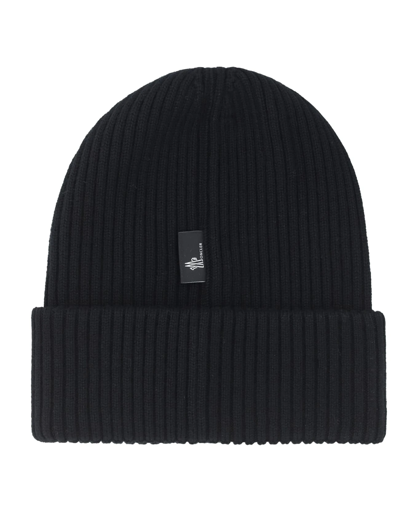 Fleece wool tricot beanie hat by moncler grenoble, monochrome ribbed design, patch with iconic brand monogram applied on the front.