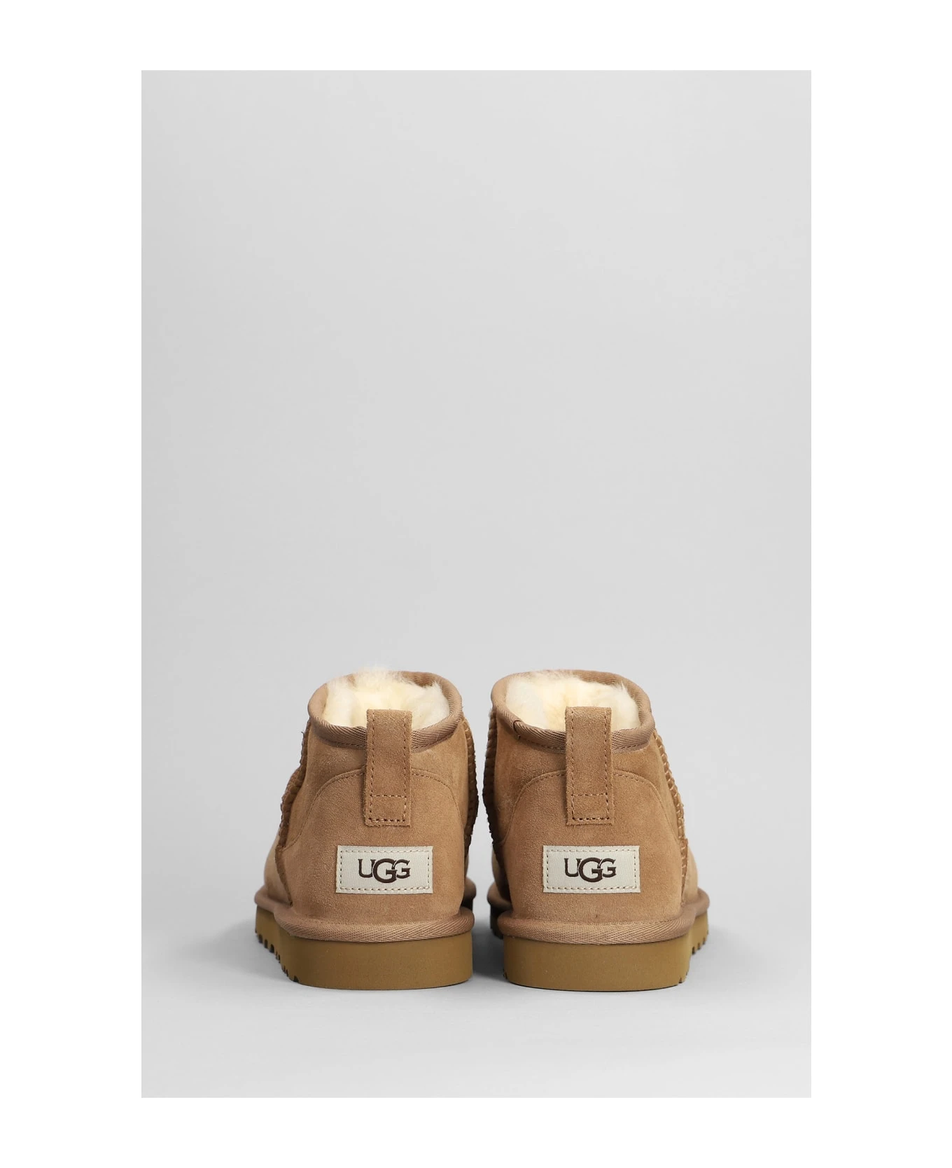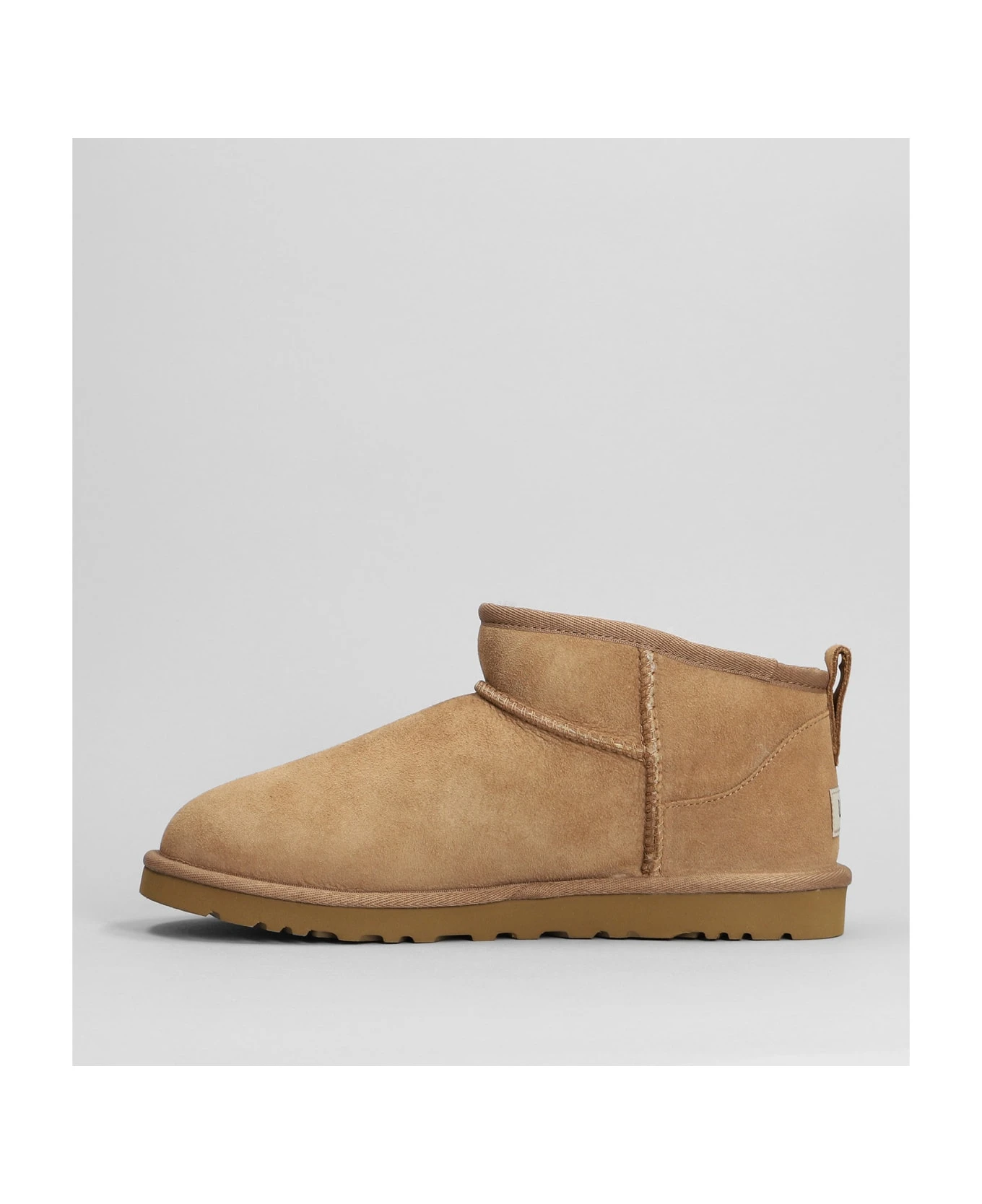 Classic Ultra Mini low heels Ankle boots in leather color suede, almond toe, contrasting stitching, logo on heel, shearling detail, rubber outsole, 100% suede, Made in Vietnam
