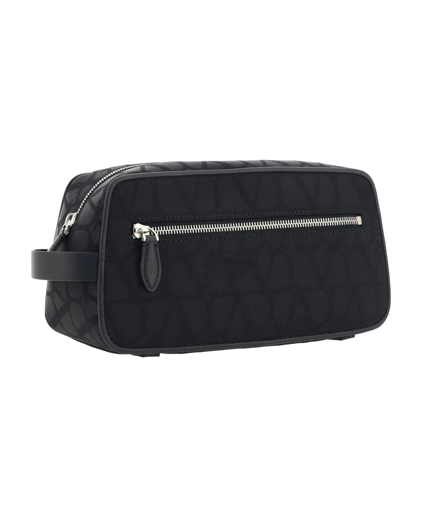 Beauty case by valentino garavani, leather pull on side panel, iconic all-over repeated brand vlogo, top zipper closure, front welt pocket. toile iconographe collection.