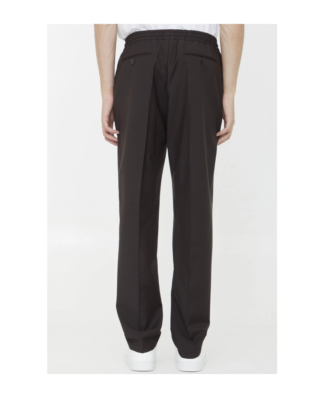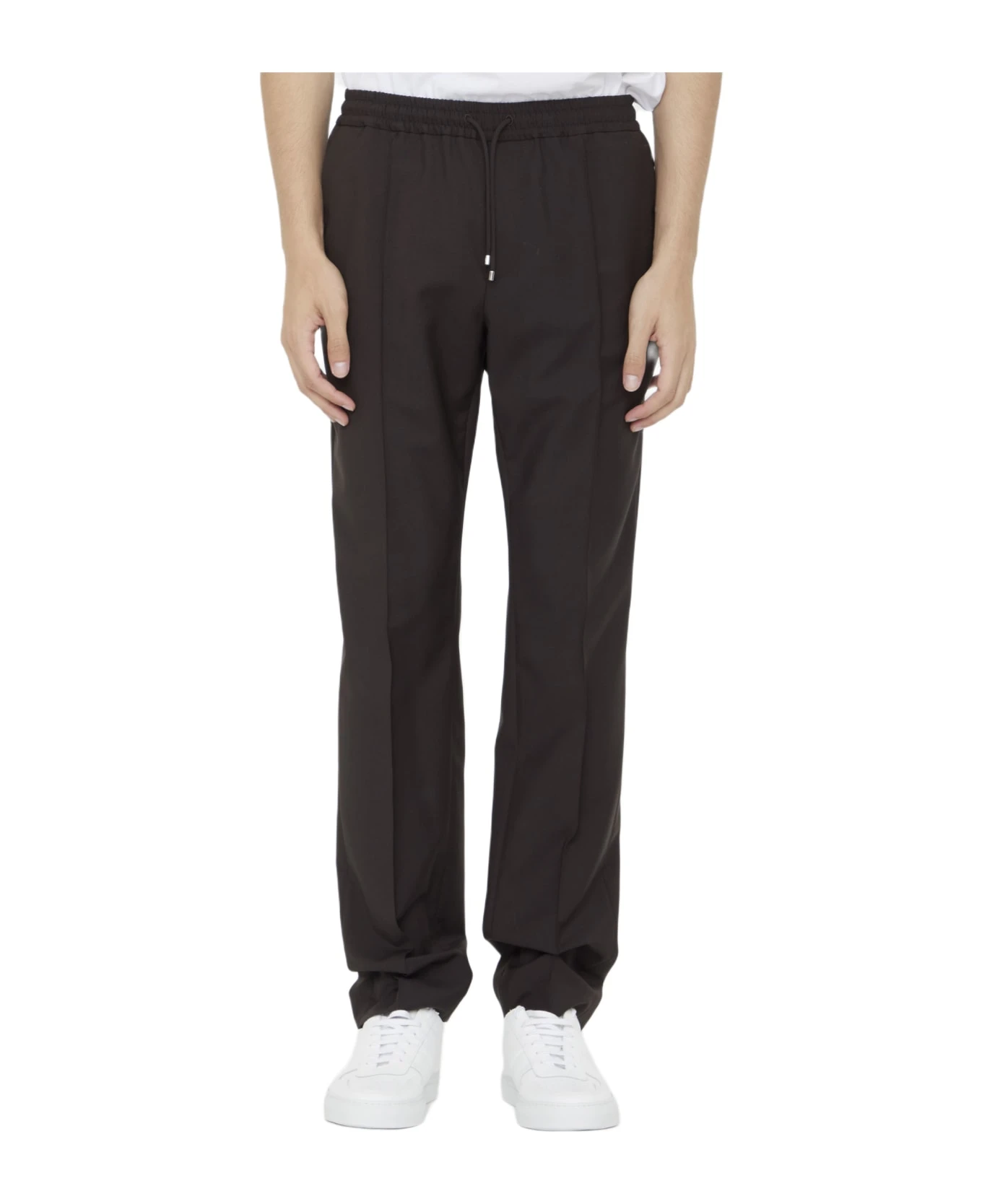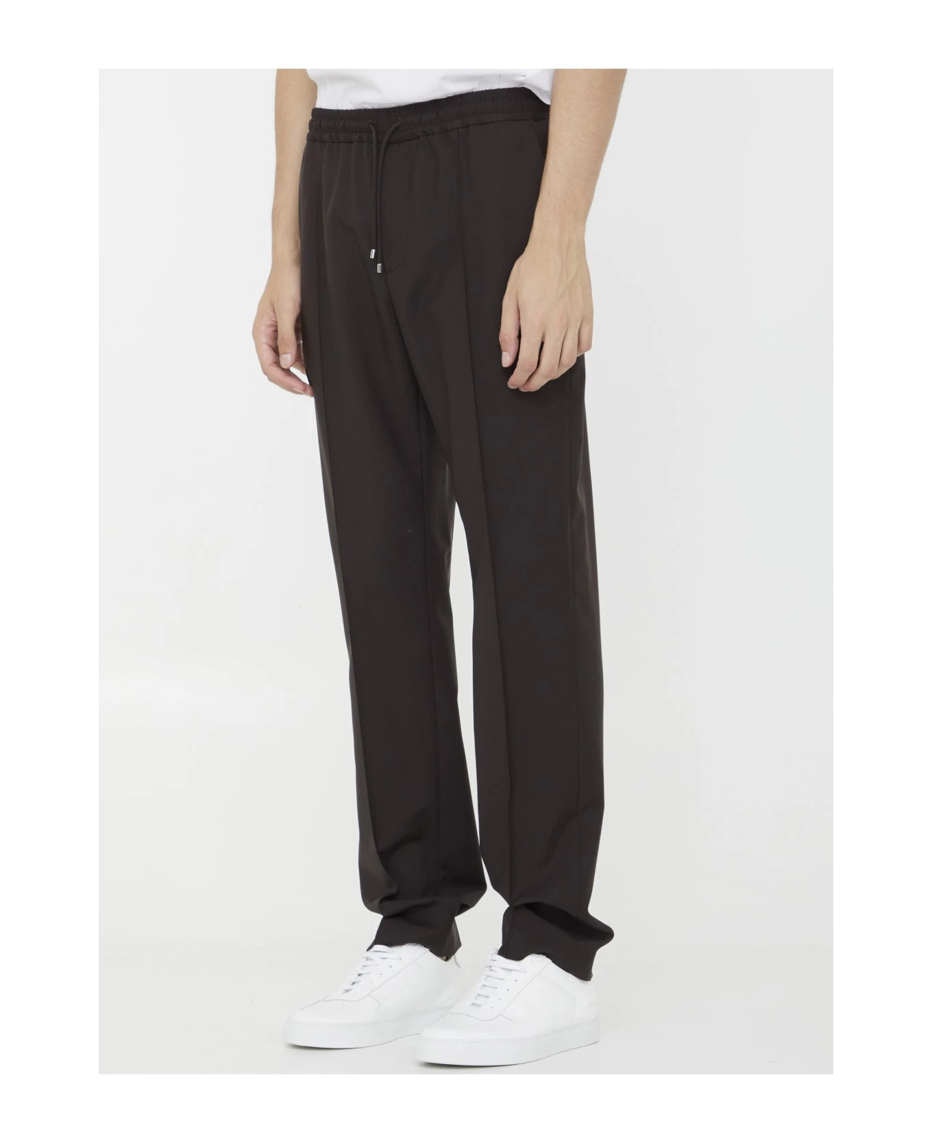 Pleated joggers in brown wool. It features stretch waistband with drawstring, two side welt pockets and two rear buttoned welt pockets.