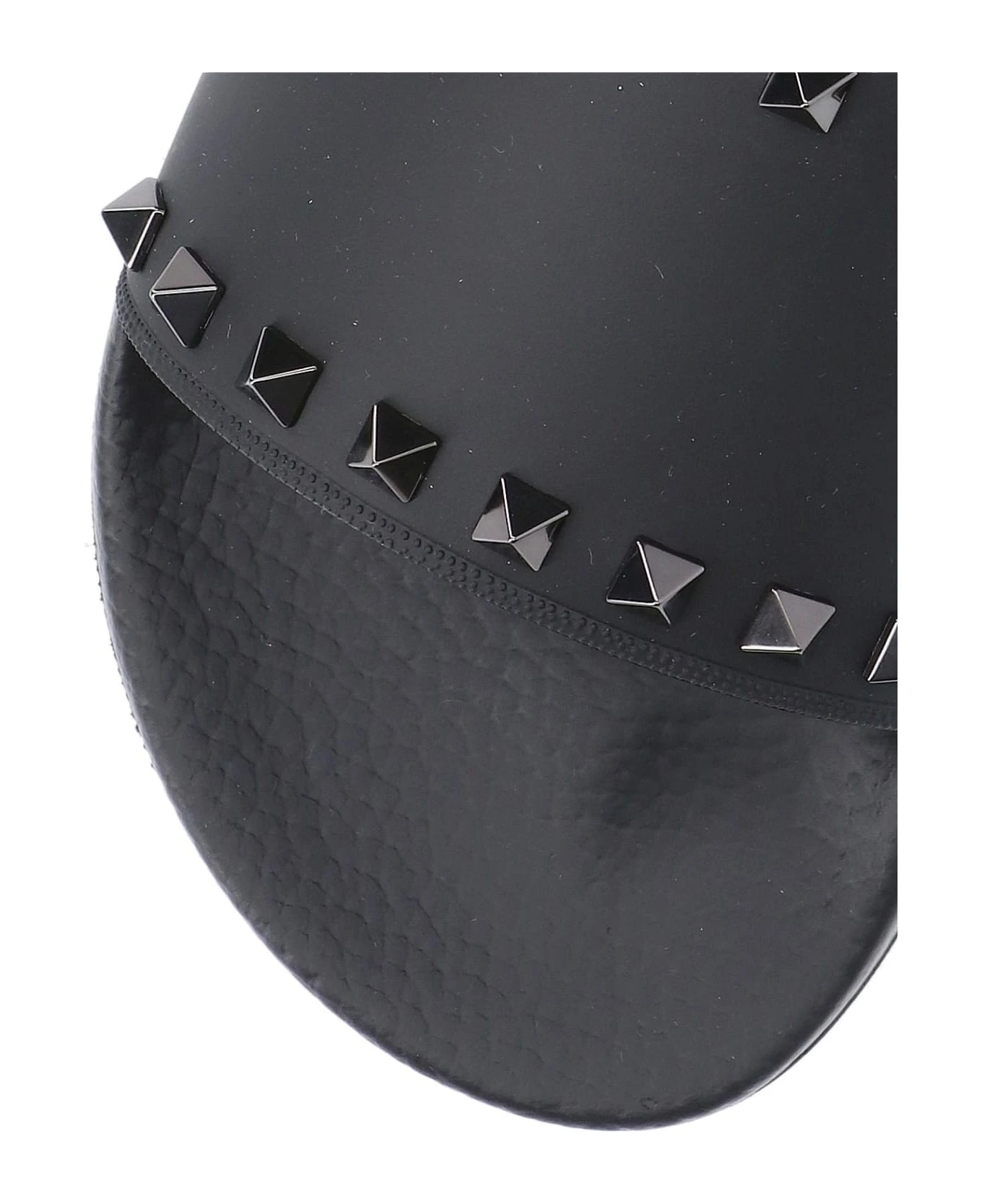 Valentino Garavani ‘Rockstud’ slides in black rubber with open round toe cap, upper wide band, tone-on-tone stud appliqu and slip-on fit.