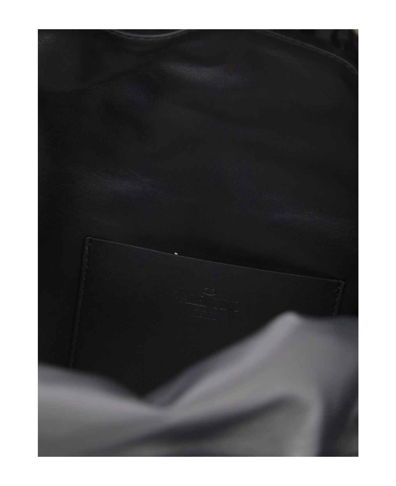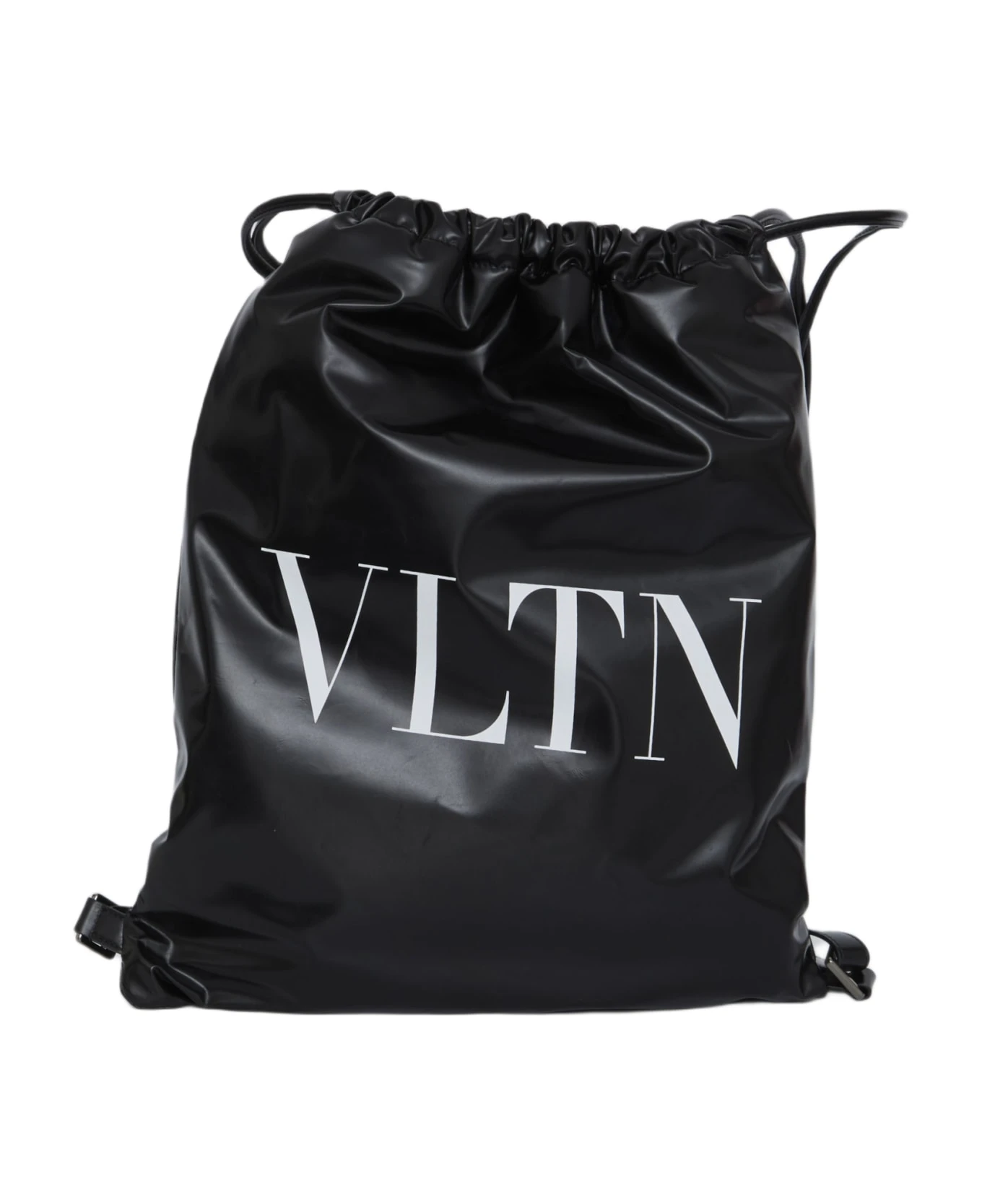 Valentino Garavani VLTN Soft backpack in soft black calfskin with white VLTN print on the front. It features adjustable shoulder straps, drawstring closure, one wide main interior compartment and one interior slip pocket.