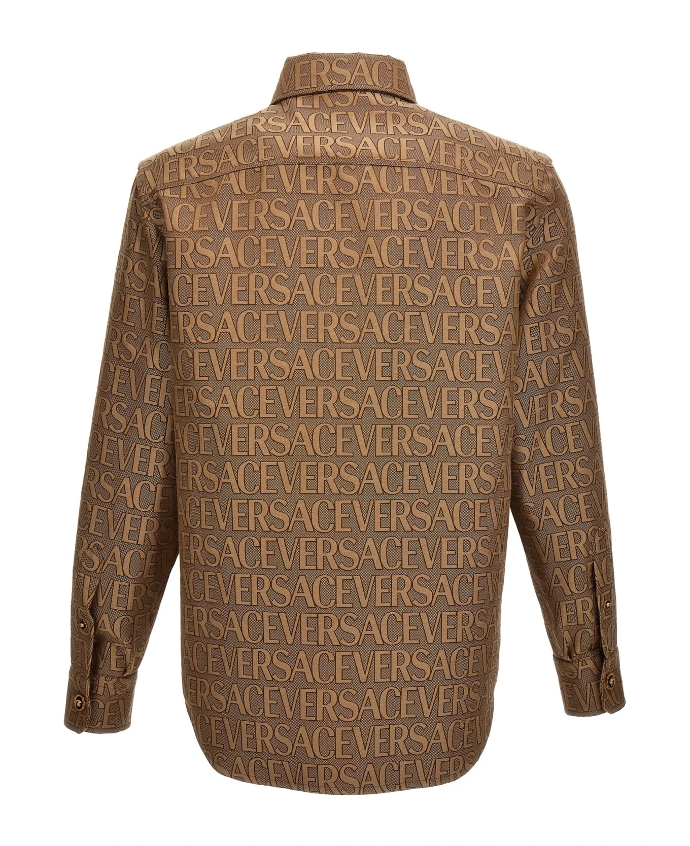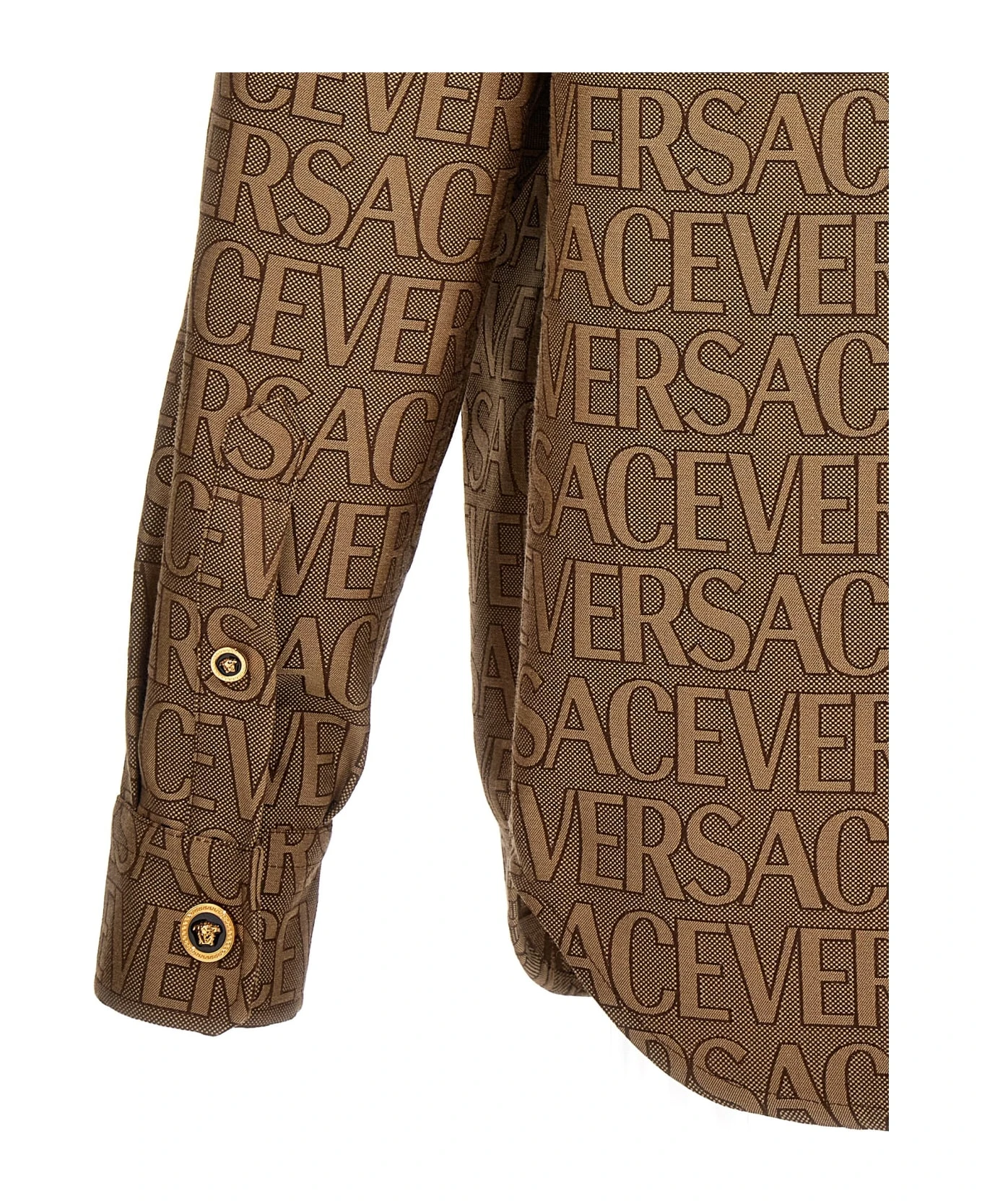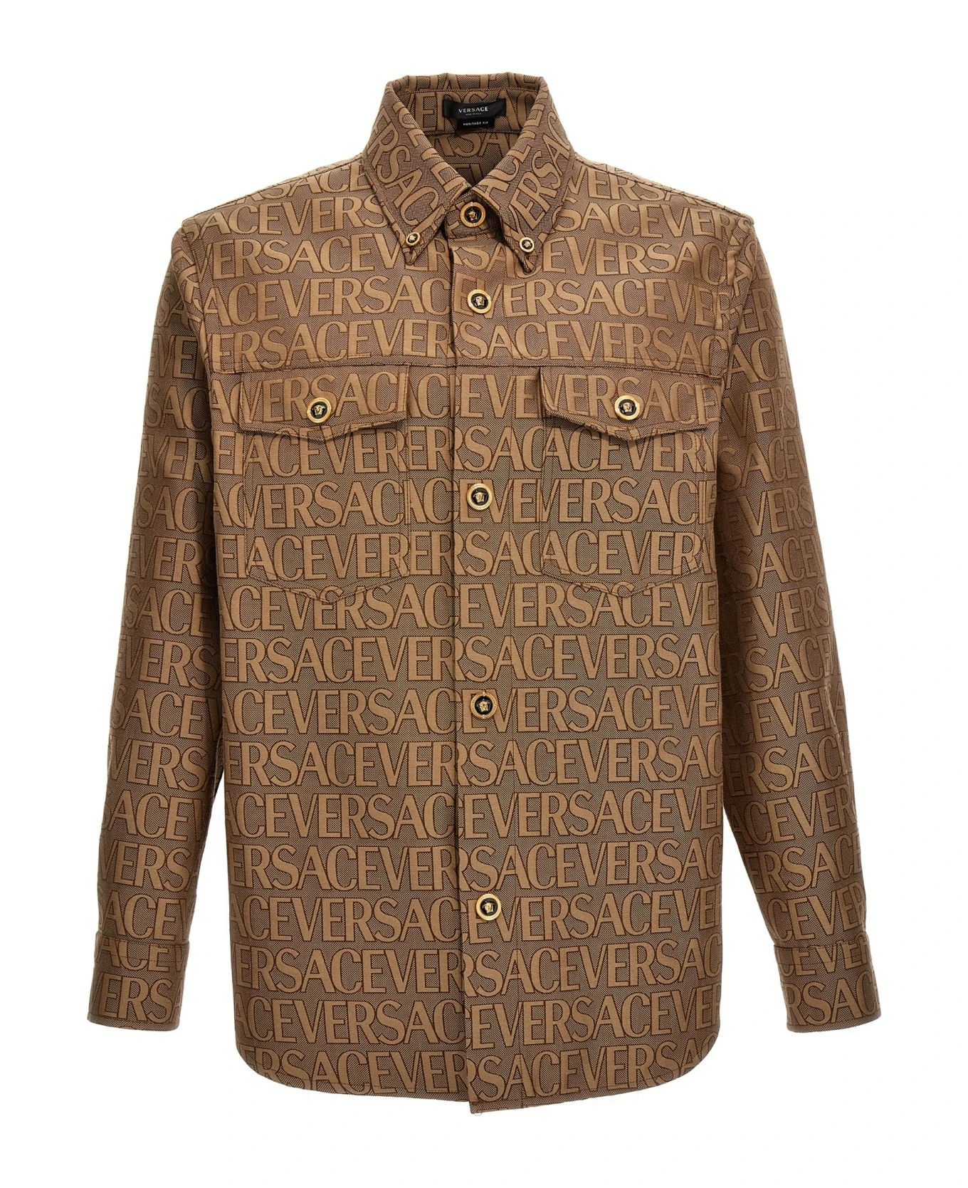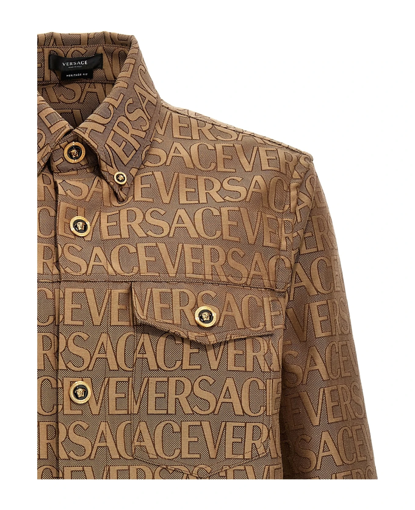 La Vacanza cotton blend capsule shirt with jacquard ‘Versace Allover’ pattern, Medusa button closure, front pockets and long cuffed sleeves.