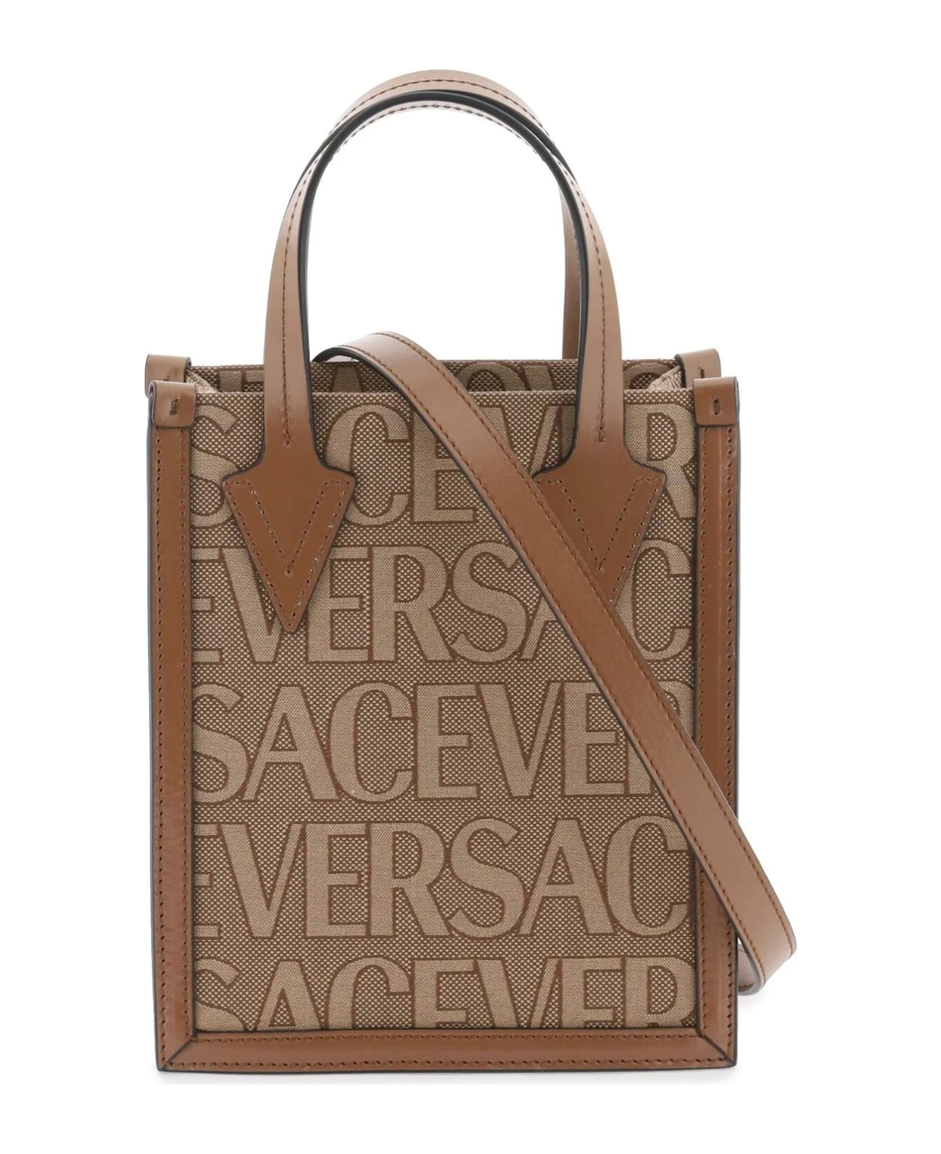 Versace small tote bag made of jacquard canvas and characterized by Versace Allover pattern. It features leather details, twill lining, interior open pocket, double top handles, adjustable and removable shoulder strap. Gold-tone metalware.