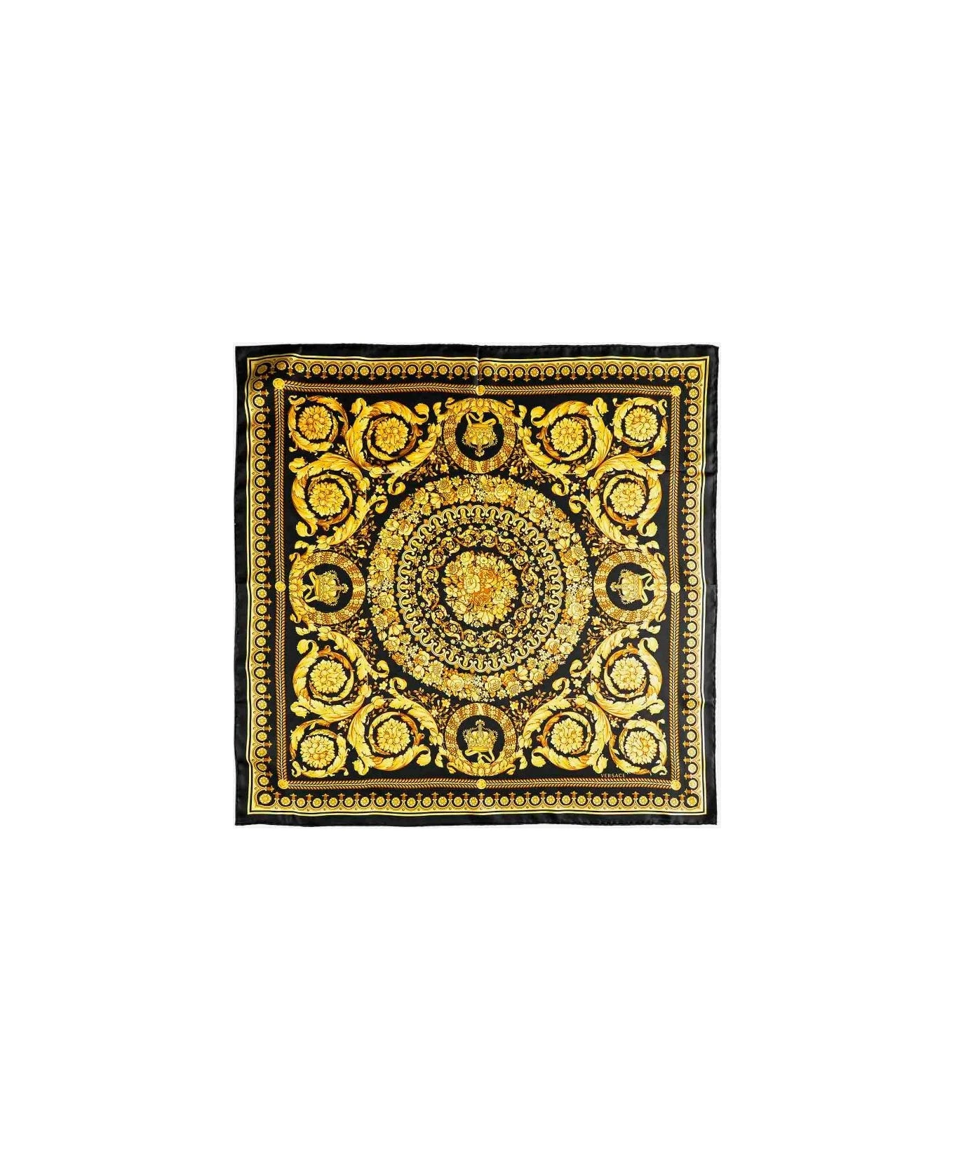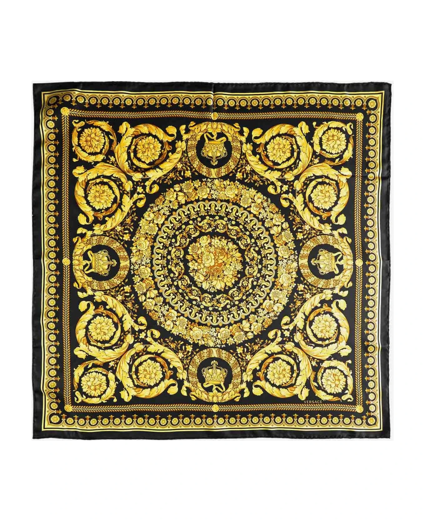 Versace’s square silk scarf featuring Barocco print print in shades of gold on a black background.