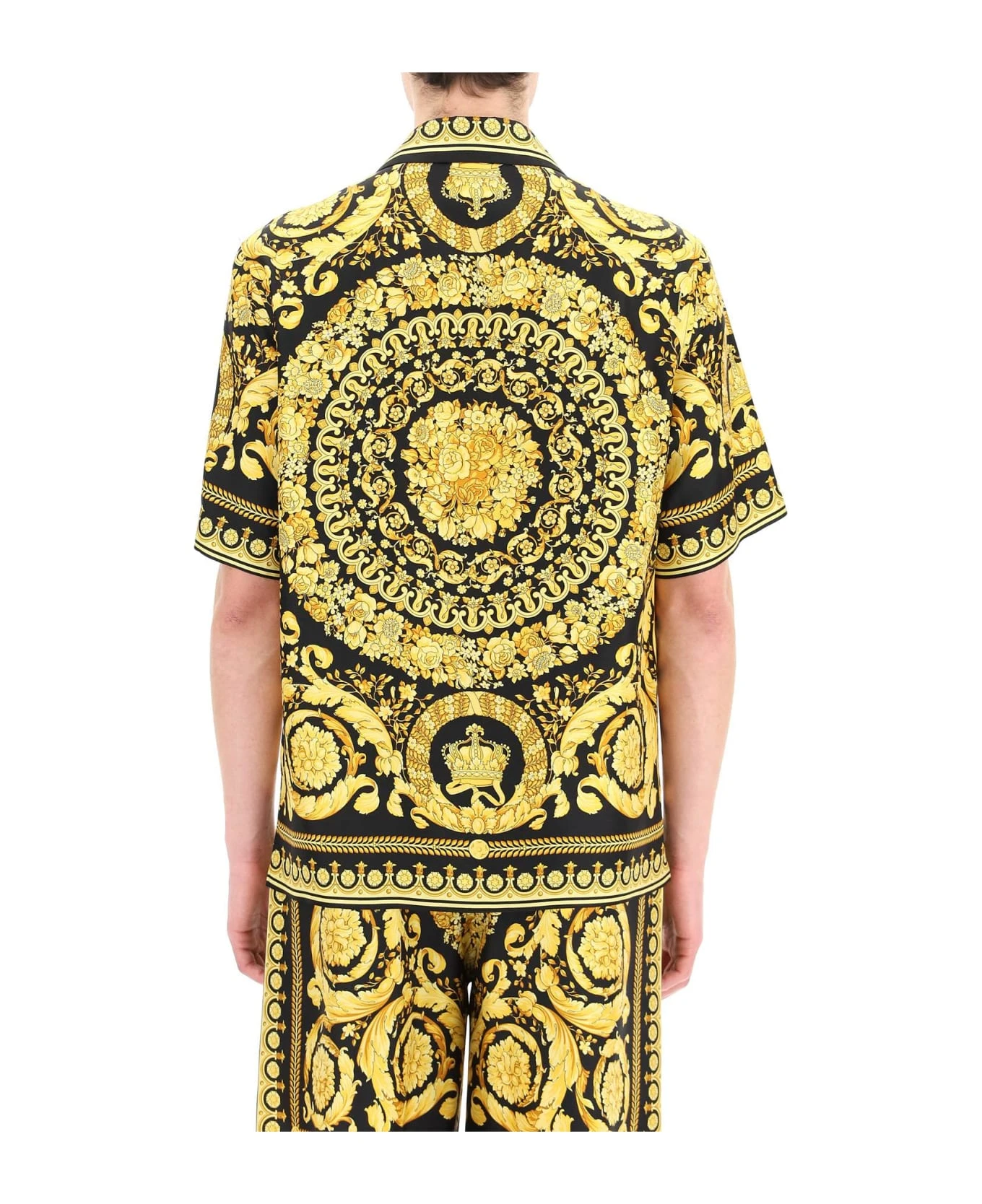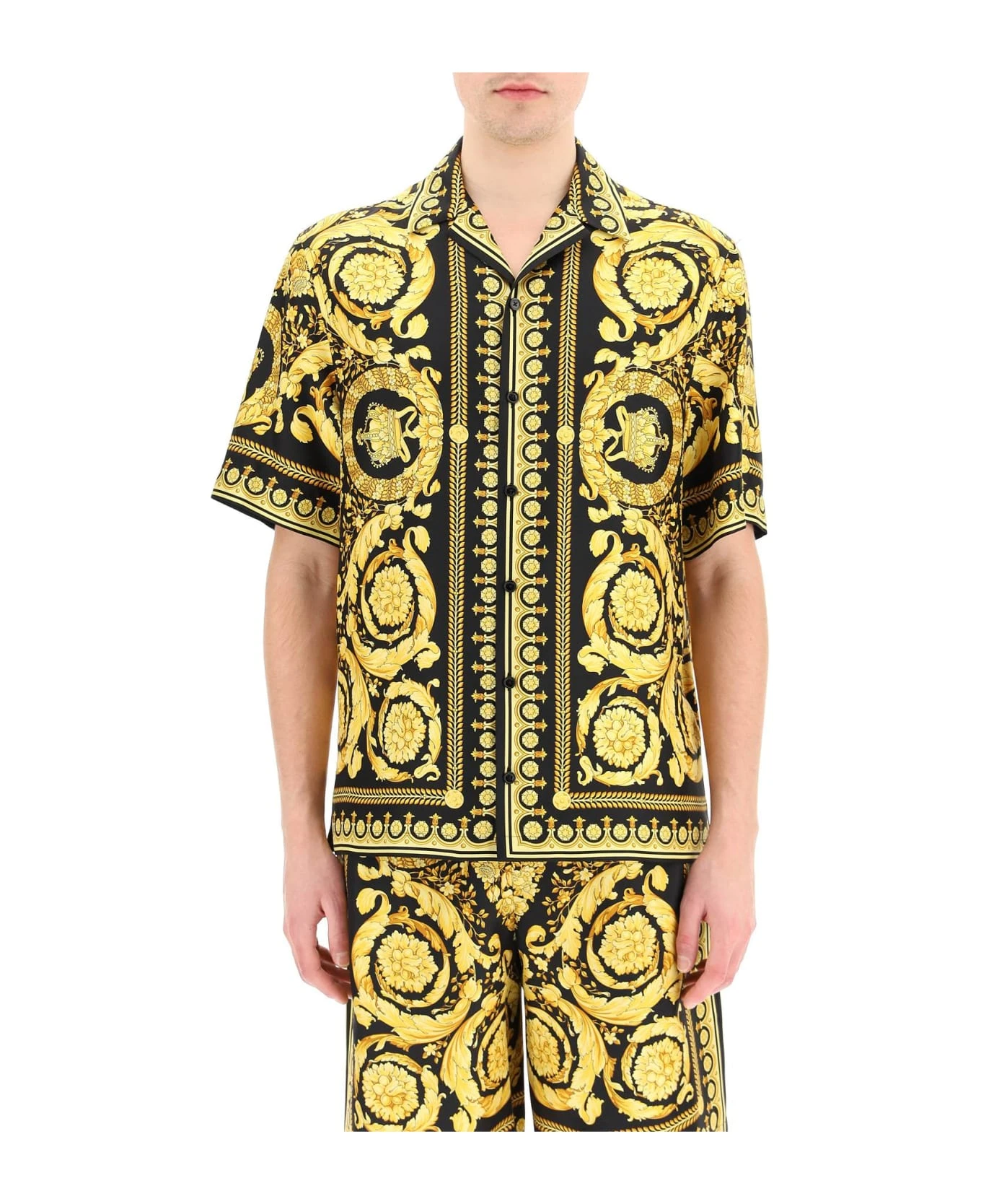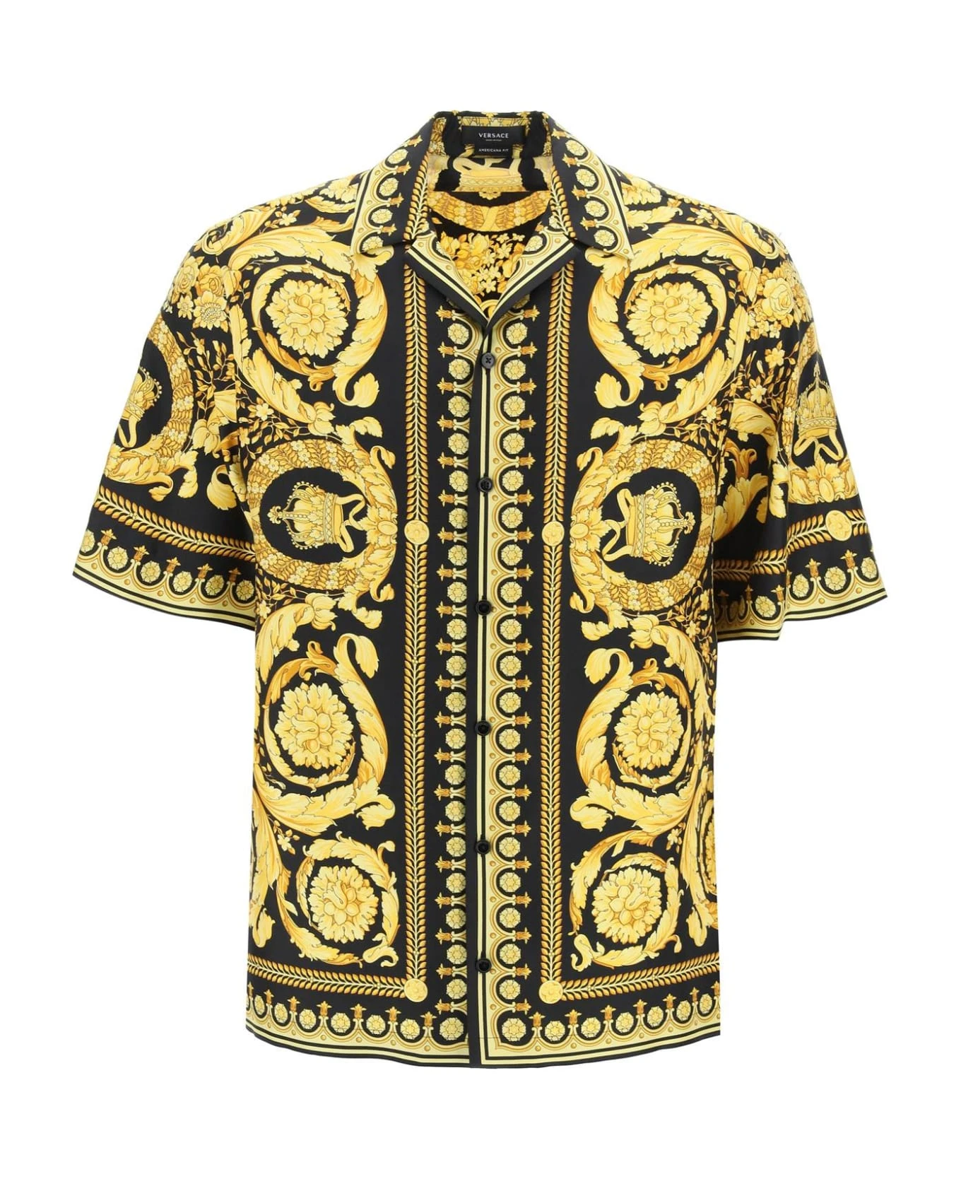 Versace short-sleeved shirt in pure silk jacquard twill with all-over Heritage Barocco print. Bowling collar, front closure with branded buttons. Loose straight cut with small side slits at the hem. The model is 187 cm tall and wears a size IT 48.