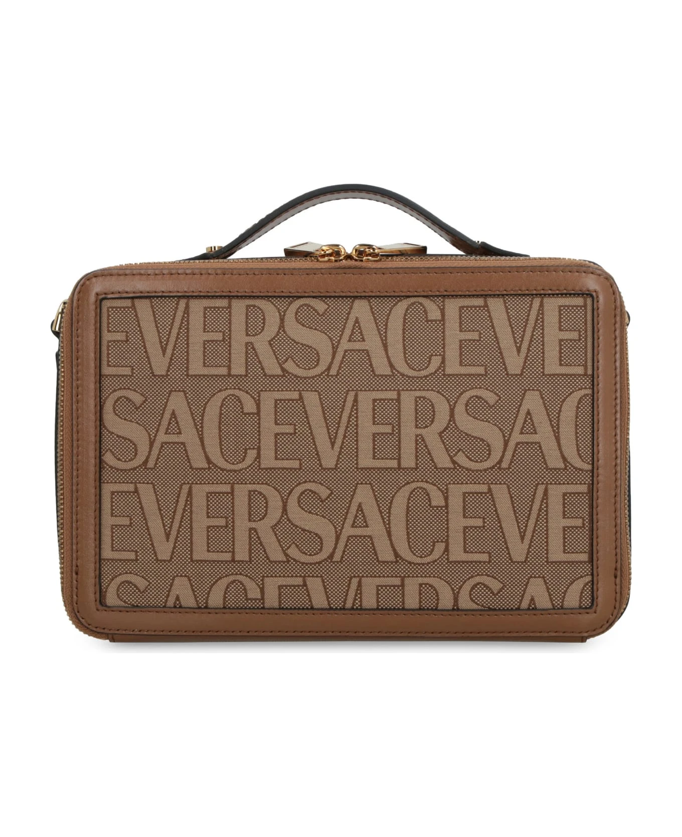 All-over logo printed canvas item with leather trimming