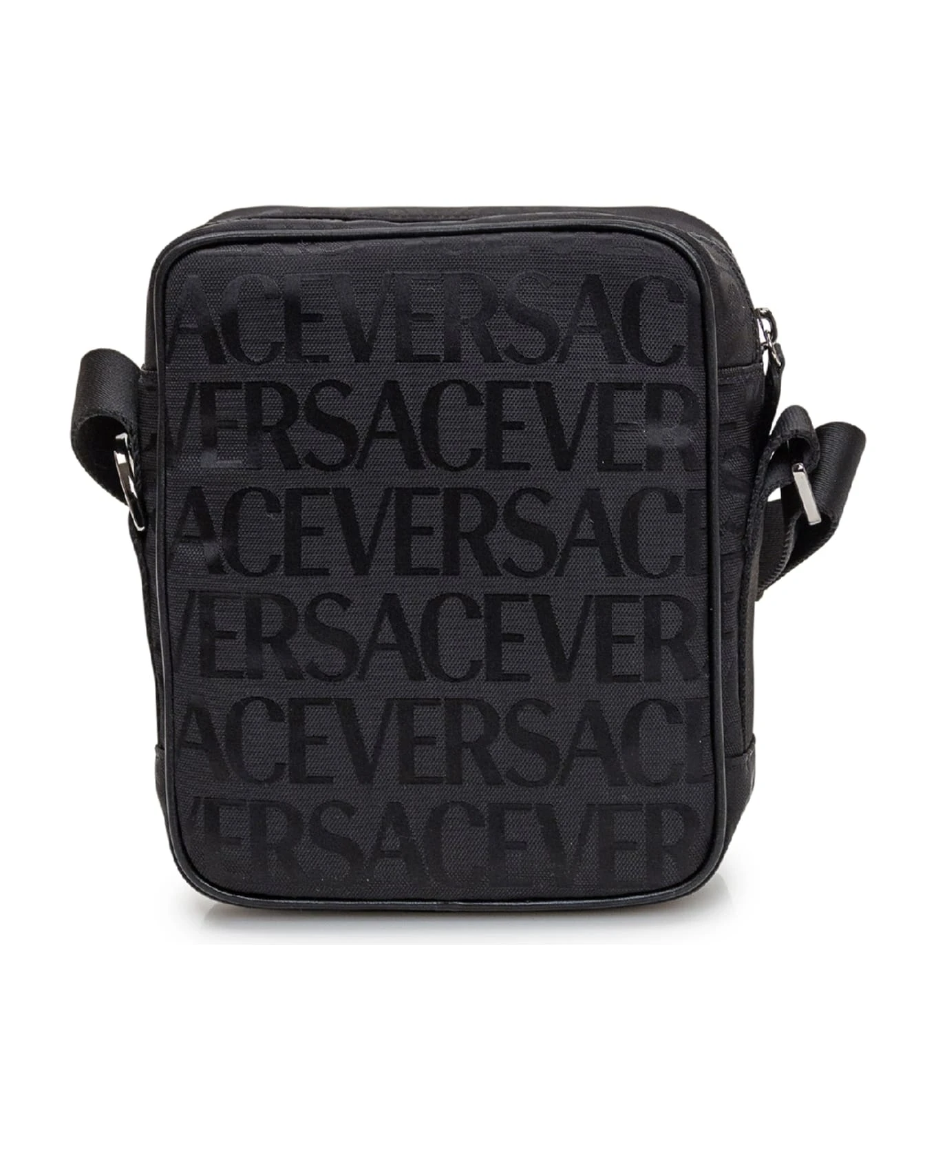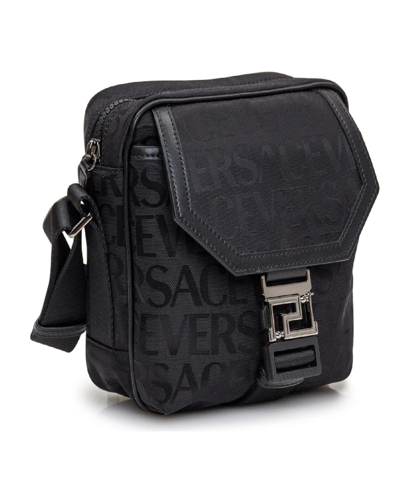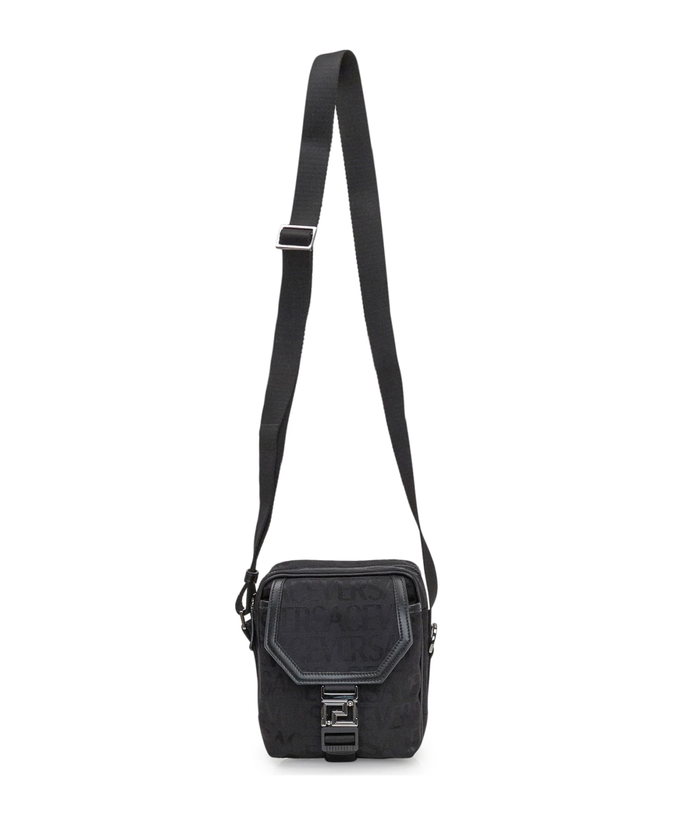 Black bag. Adjustable shoulder strap. Zip closure. Pocket with flap and buckle. Buckle with Greca. Logo all-over.