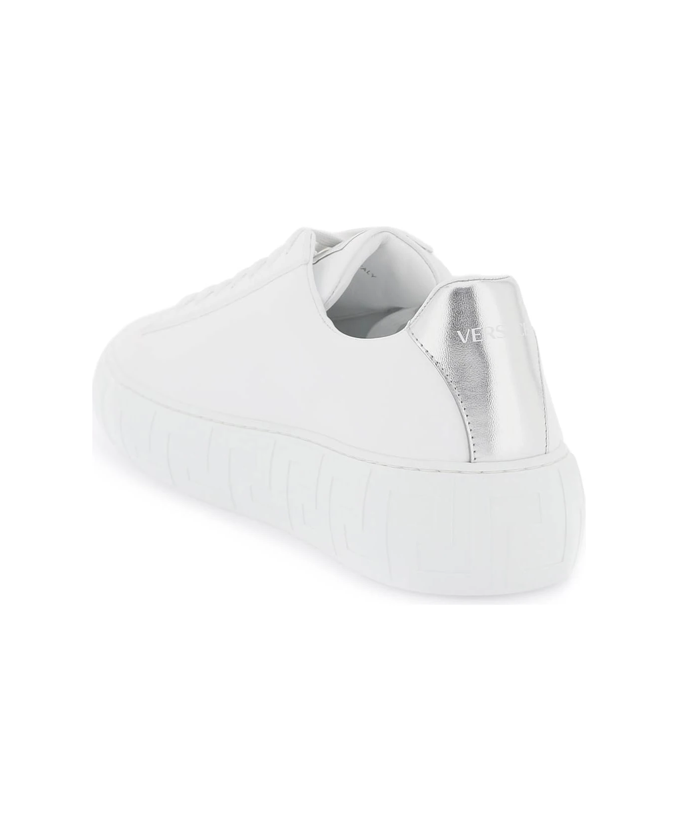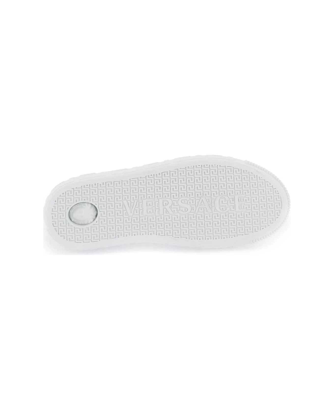 Greca sneakers by Versace crafted in smooth calf leather and decorated with silver-tone lettering logo on the side and laminated logoed heel tab. They feature lace-up closure, fabric logo label on the tongue, leather lining with removable insole, rubber sole with embossed ‘Greca’ pattern and the iconic Medusa embedded on the bottom.