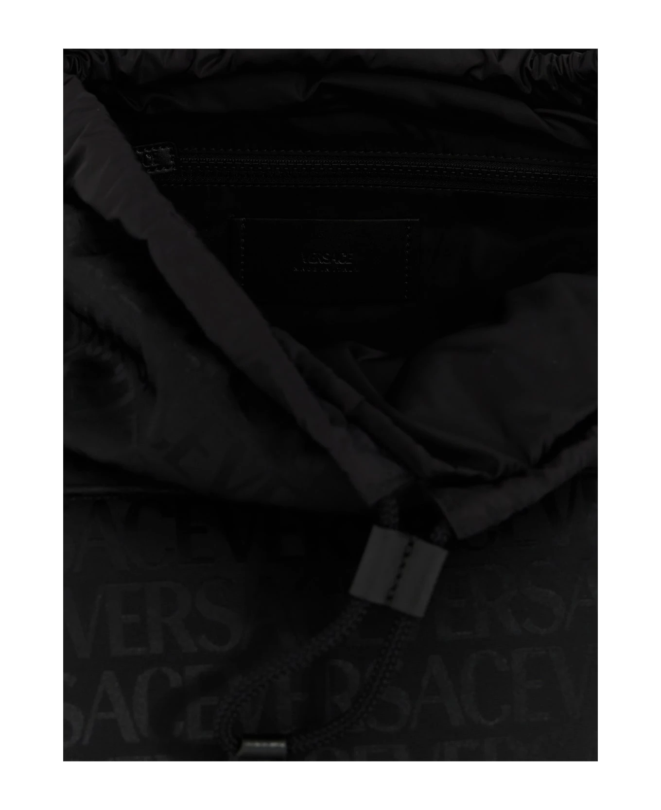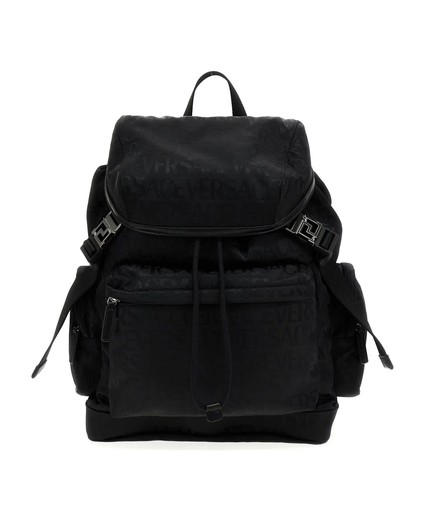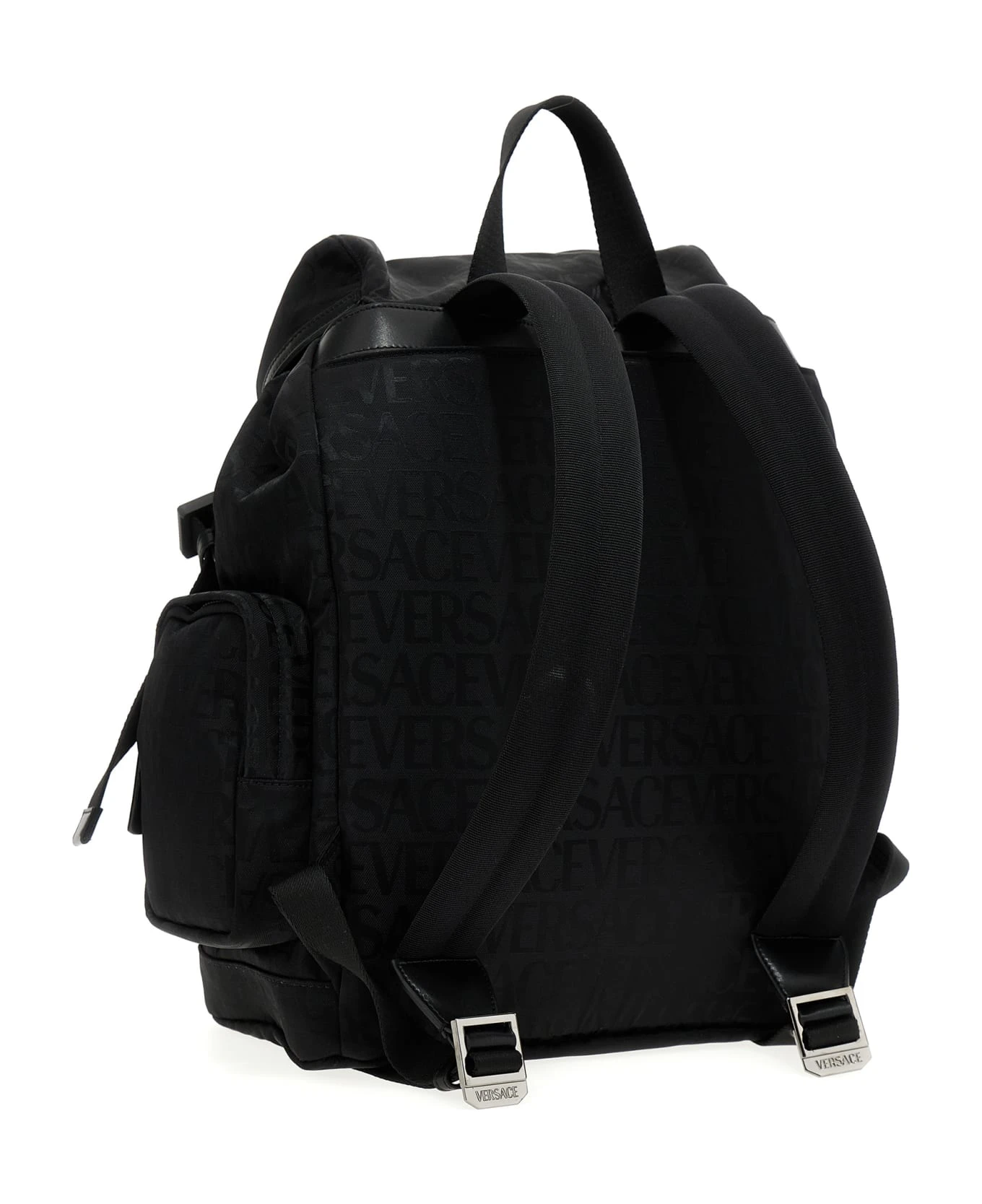 Nylon backpack with all-over jacquard logo pattern, silver leather and metal details, zip closure, adjustable shoulder straps.