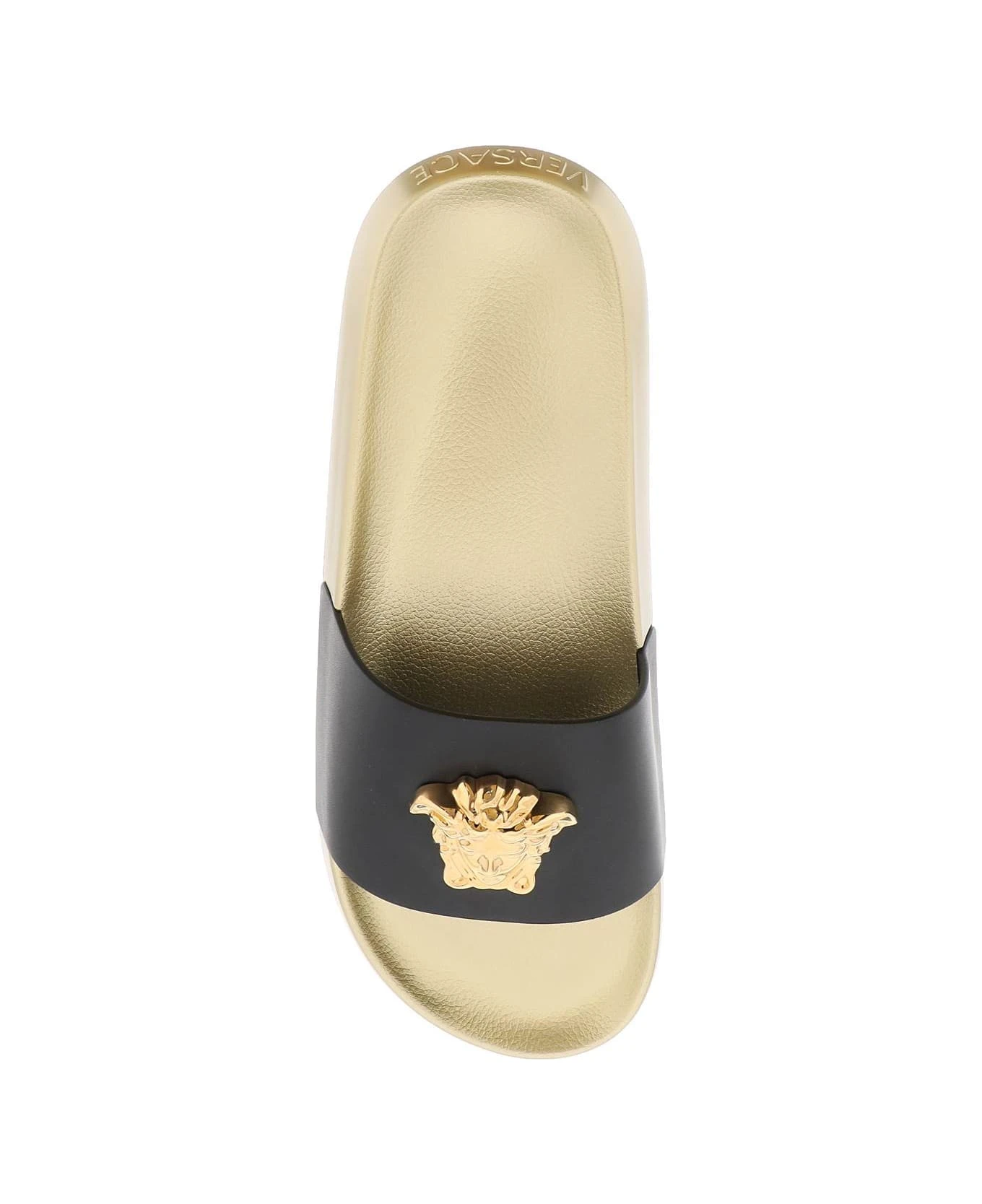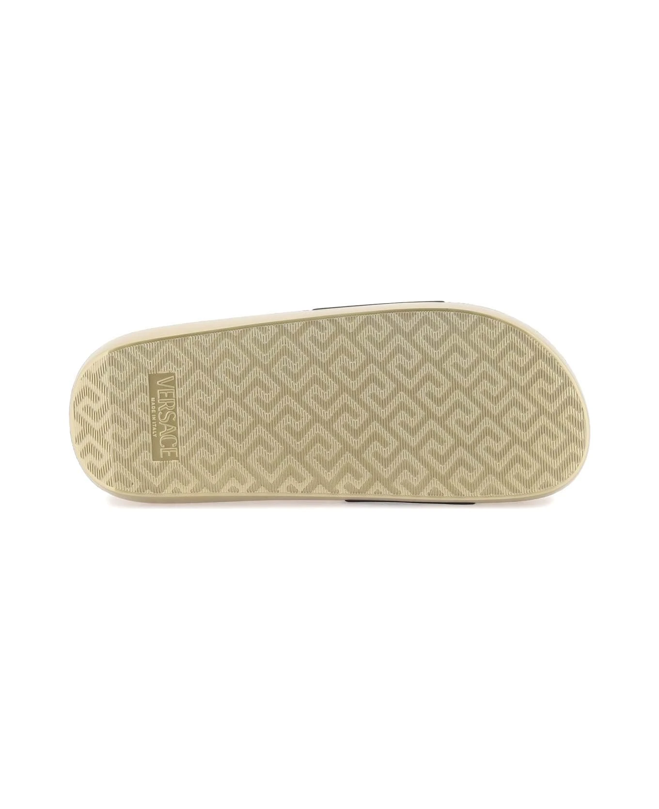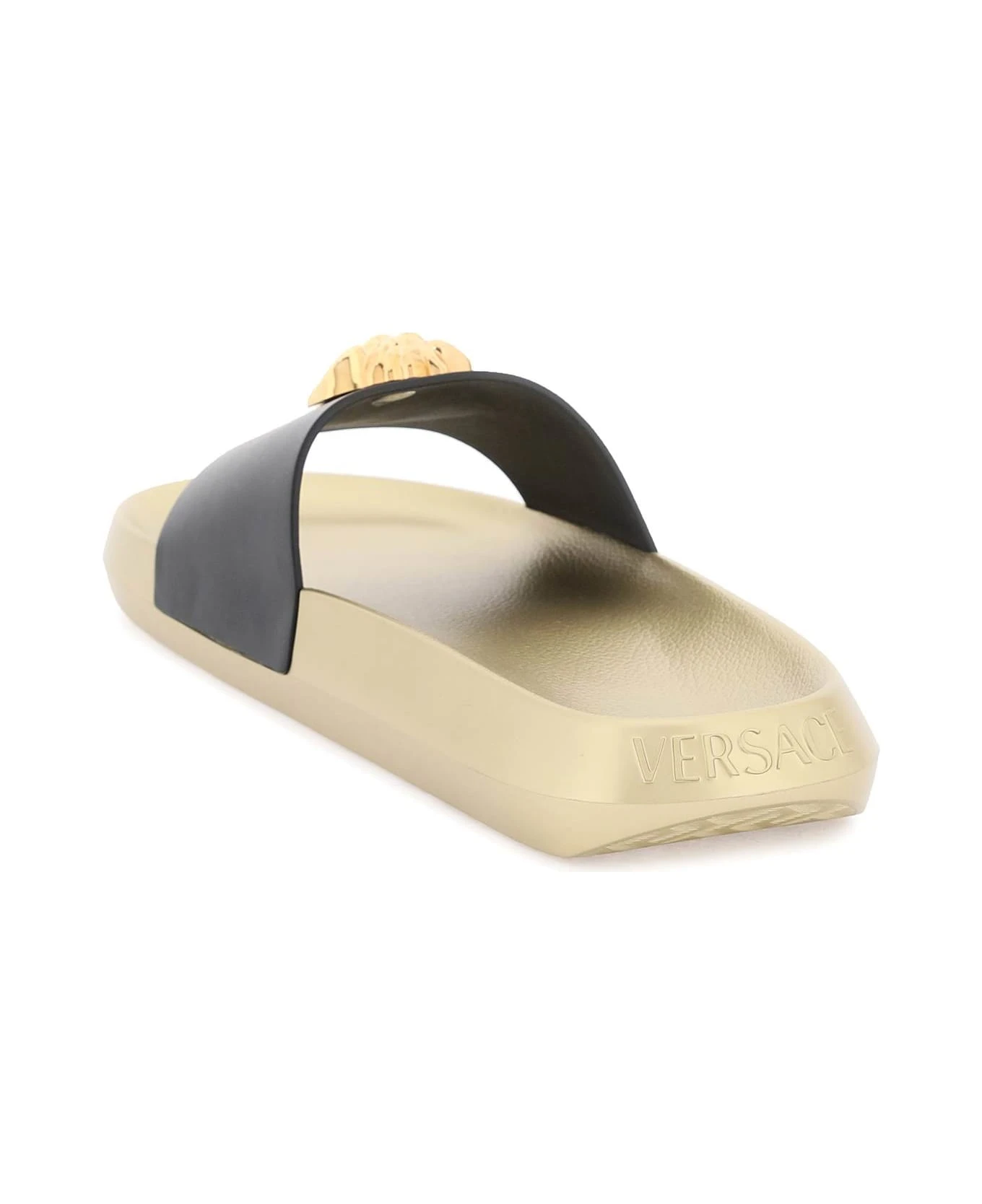 Slides by Versace with smooth leather band embellished with gold-finished La Medusa plaque and rubber sole with embossed logo at back and Greca pattern on the bottom.