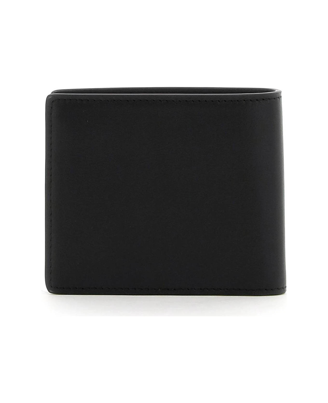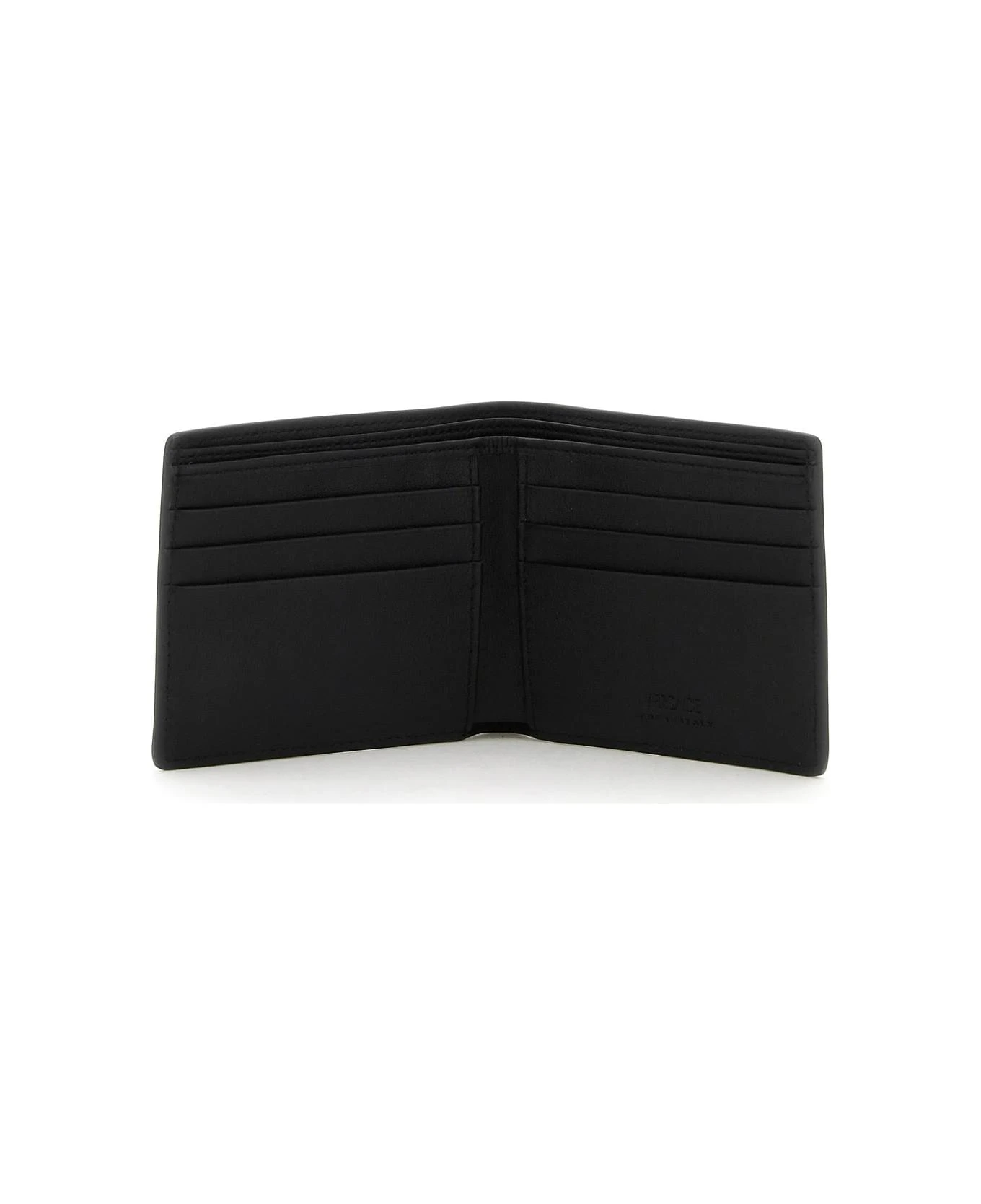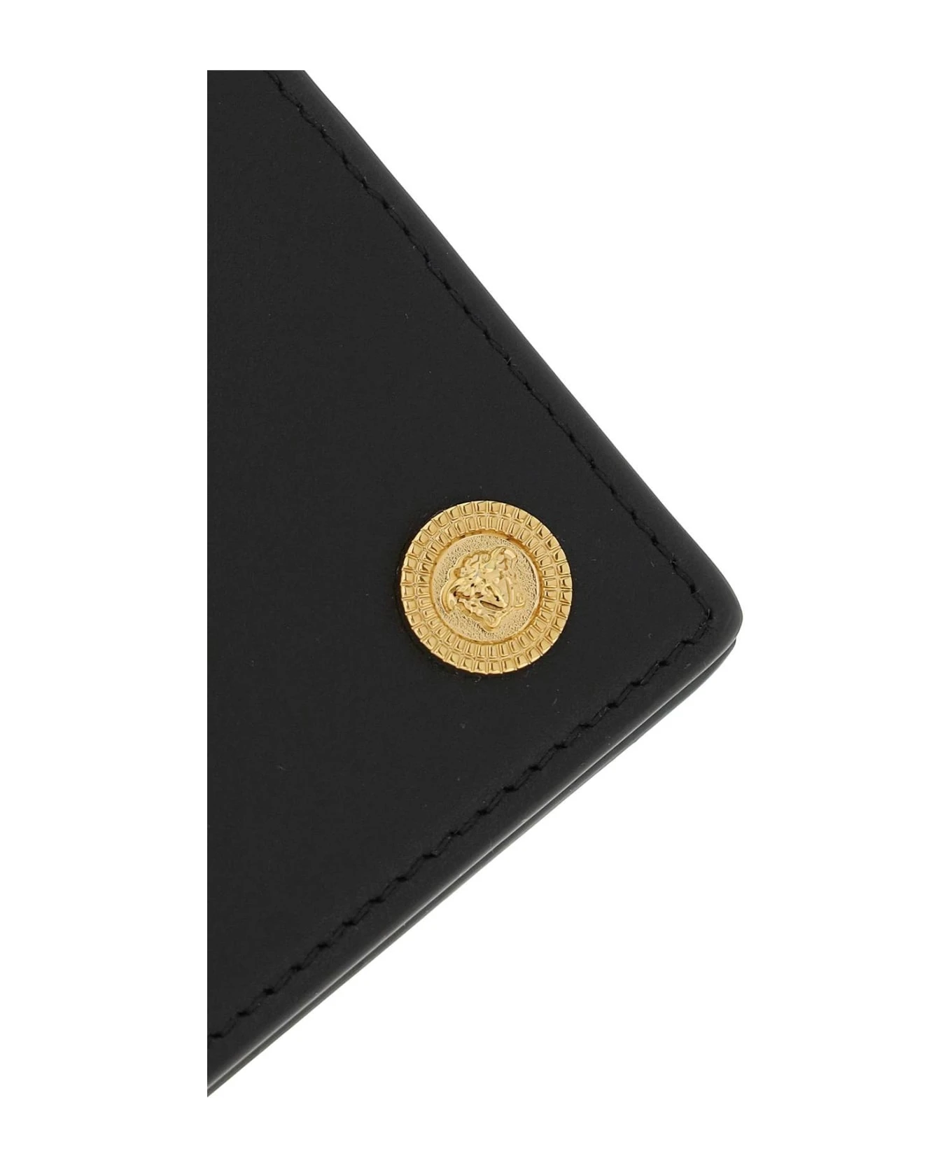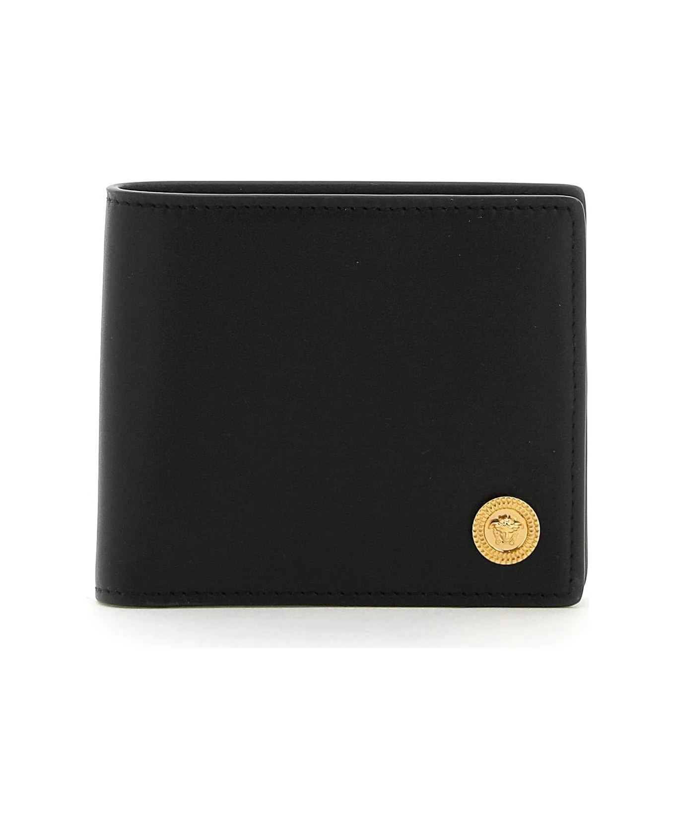 Bi-fold wallet by Versace made of smooth calfskin leather with gold-tone Medusa Biggie appliqu? on the front. Leather interior with six credit card slots, two bill compartments and two tickets pockets.