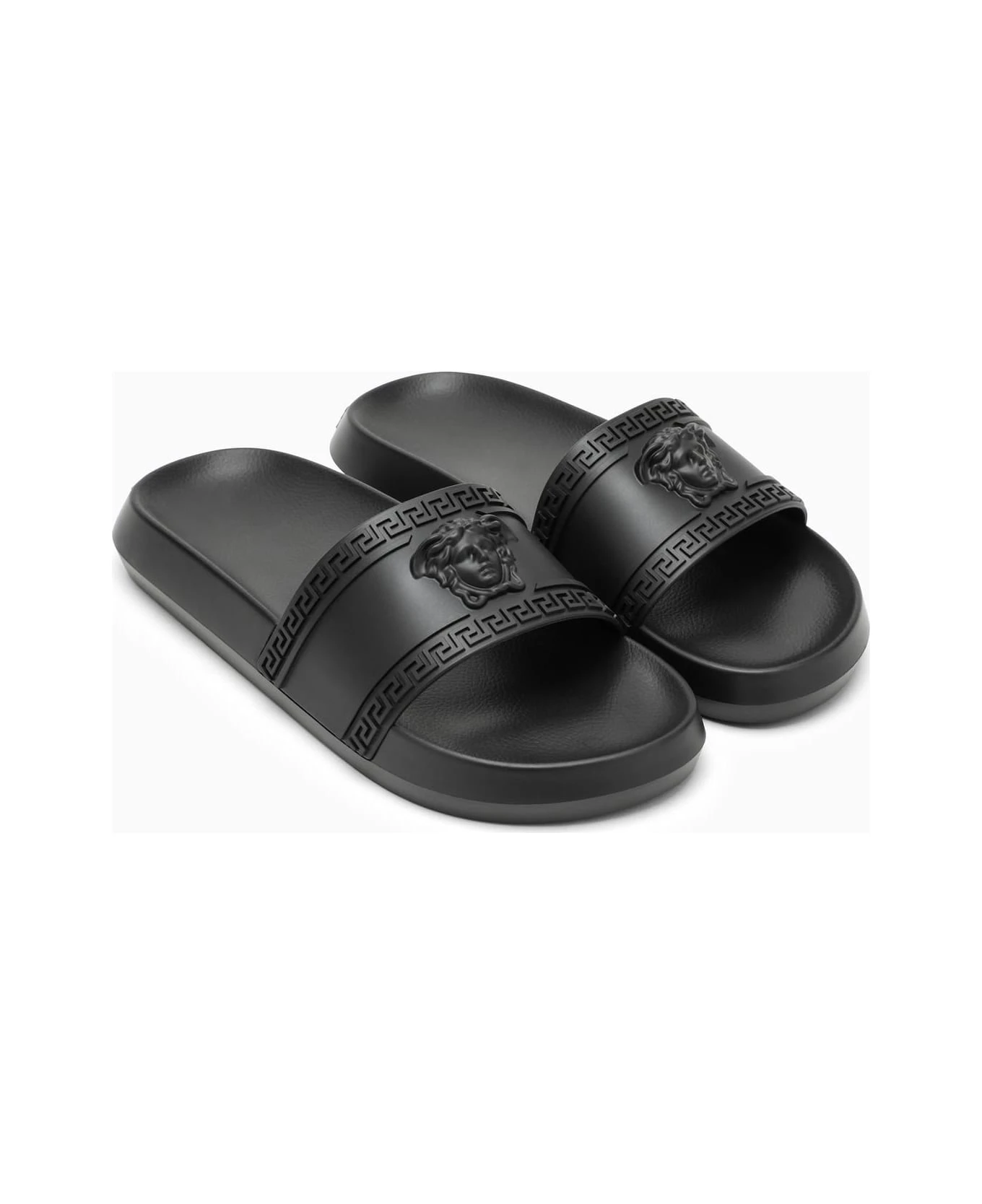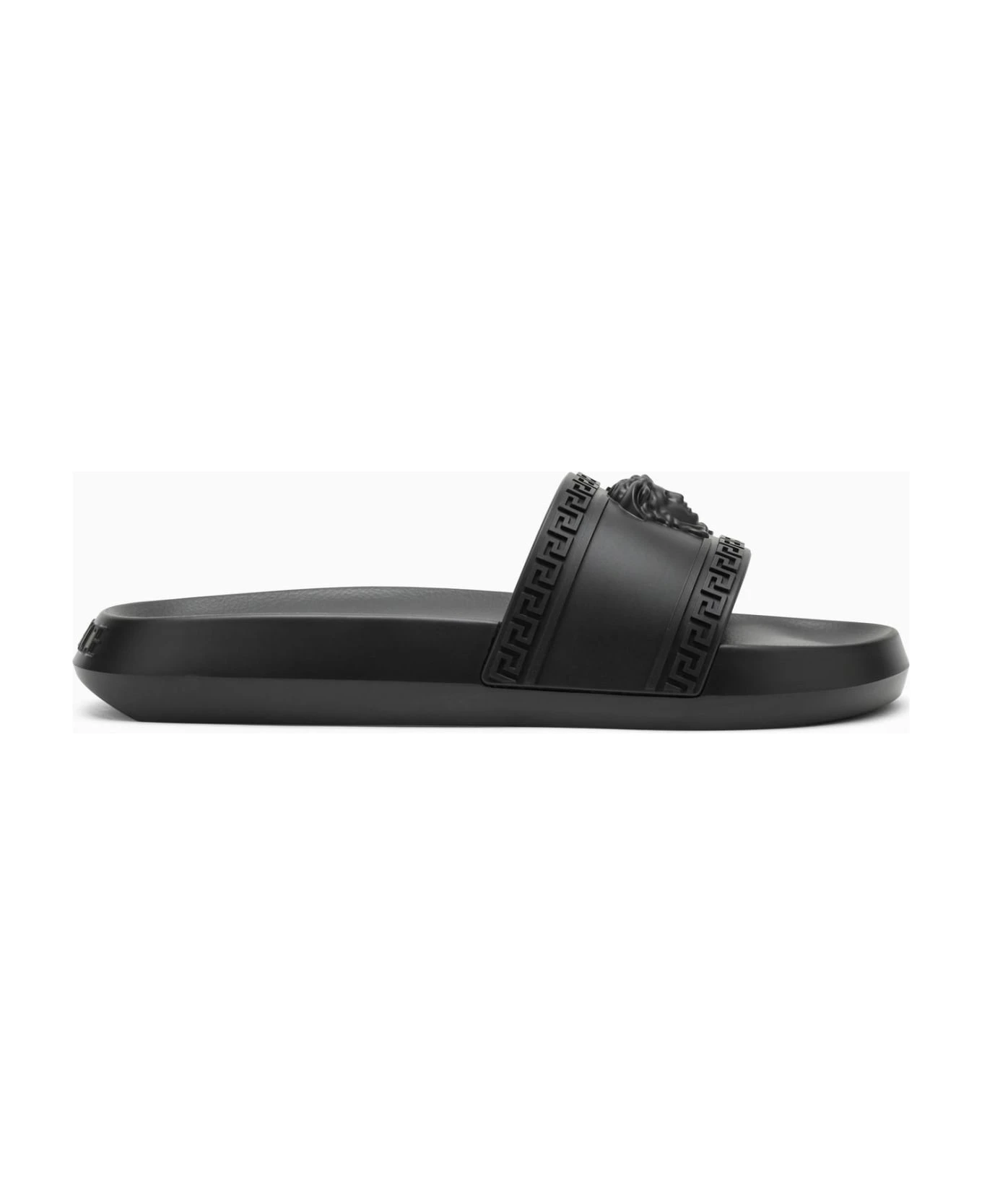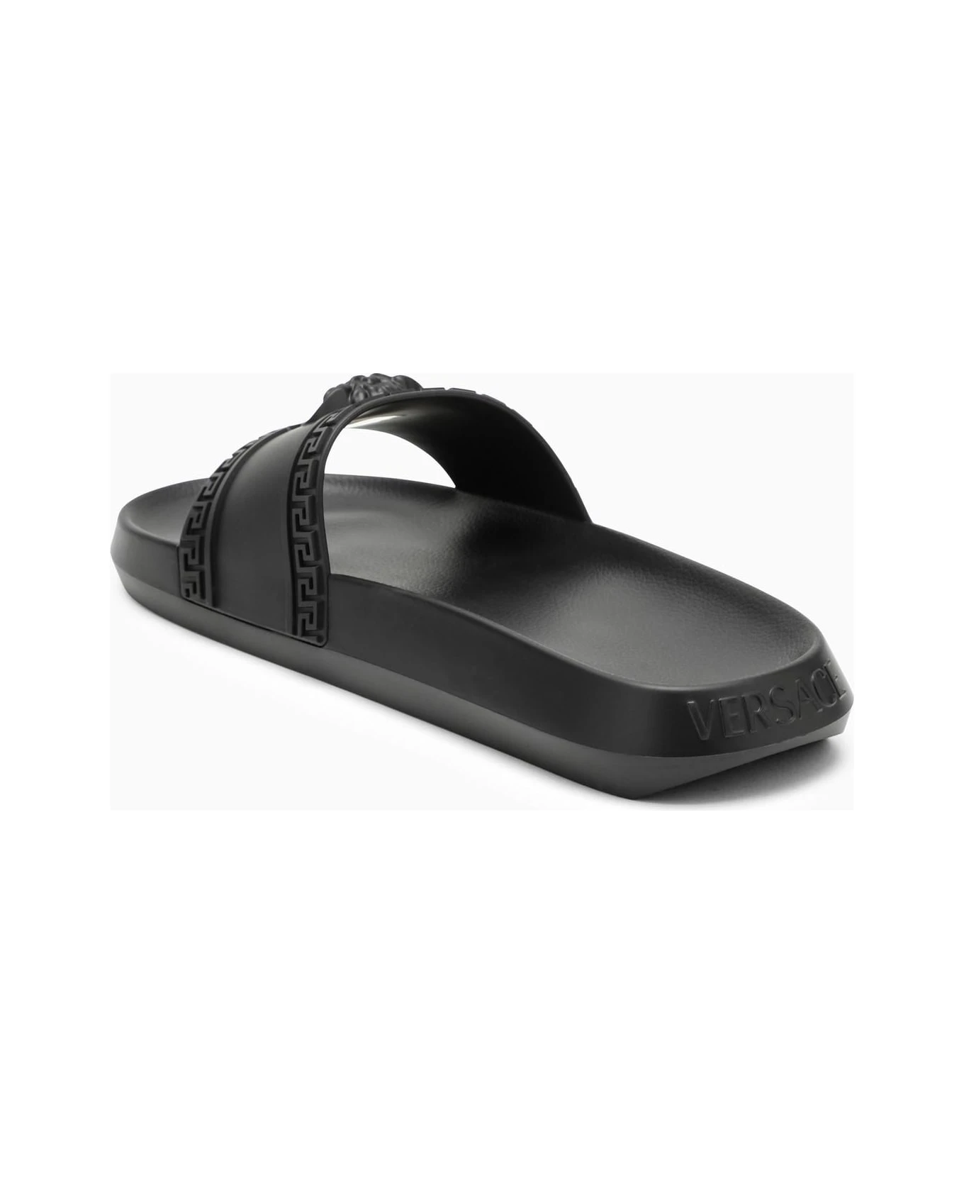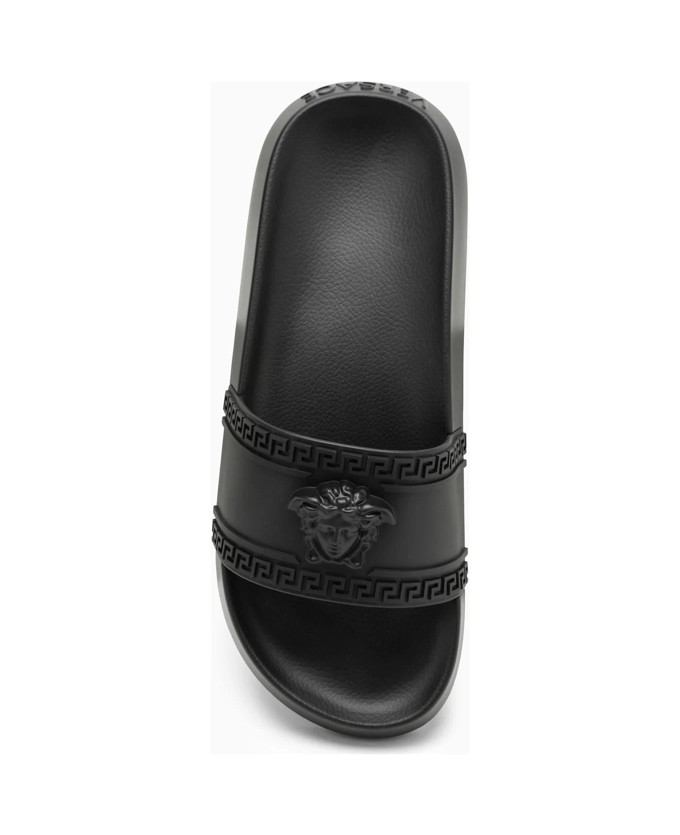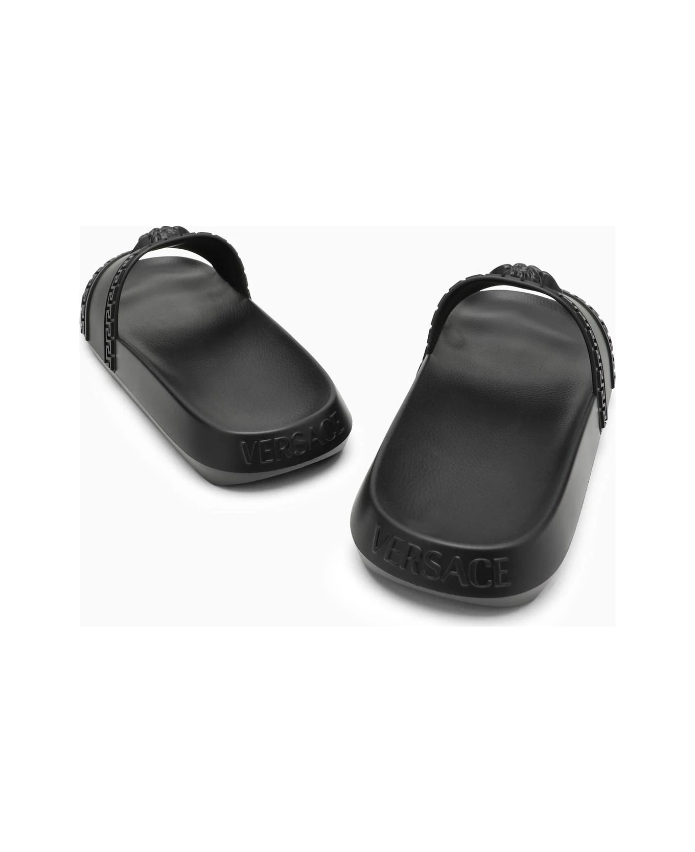Sporty black rubber slide by Versace featuring a rounded toe, upper with Medusa detail and rubber sole.