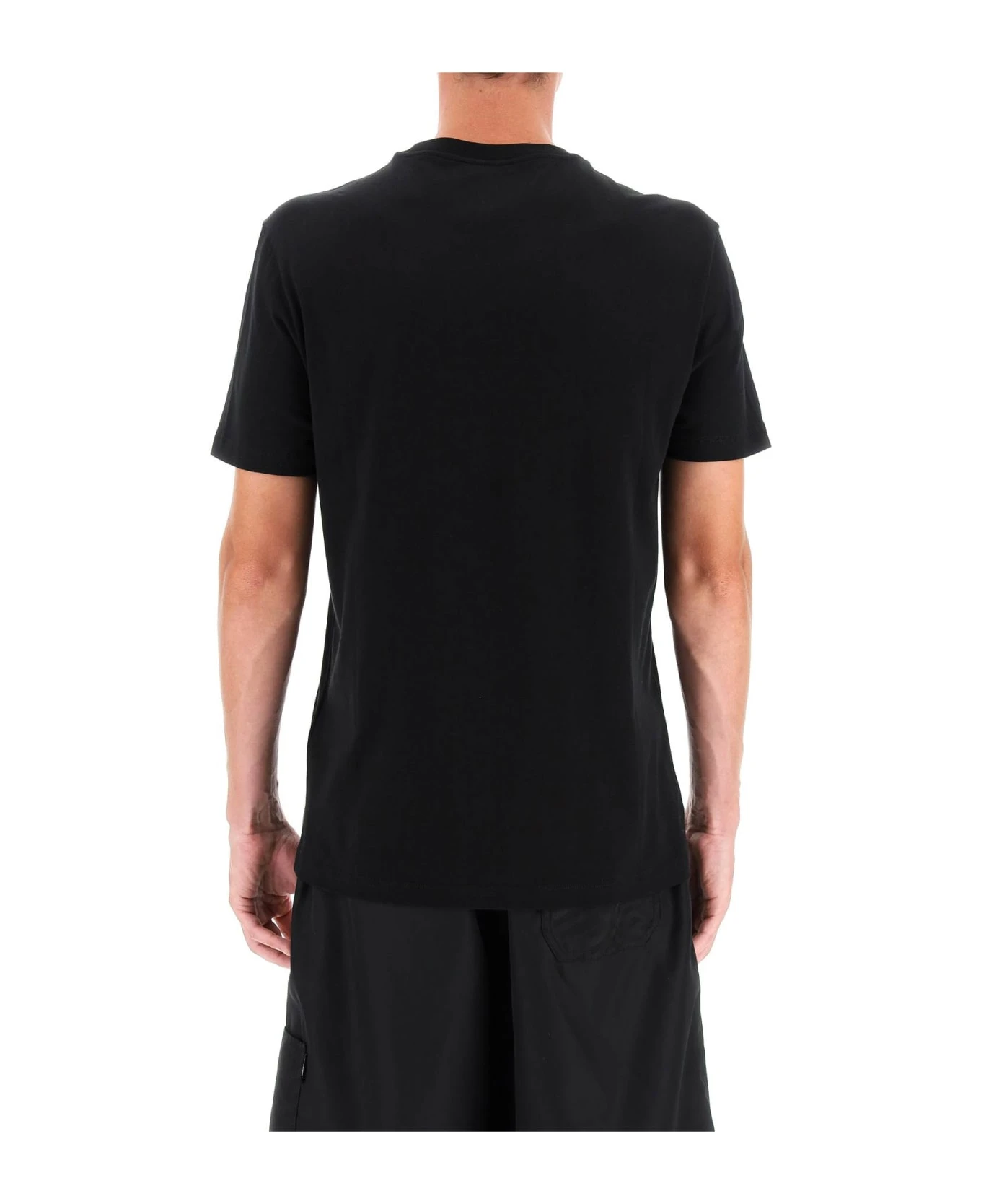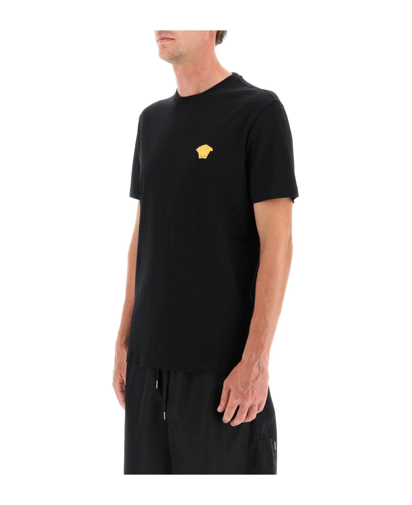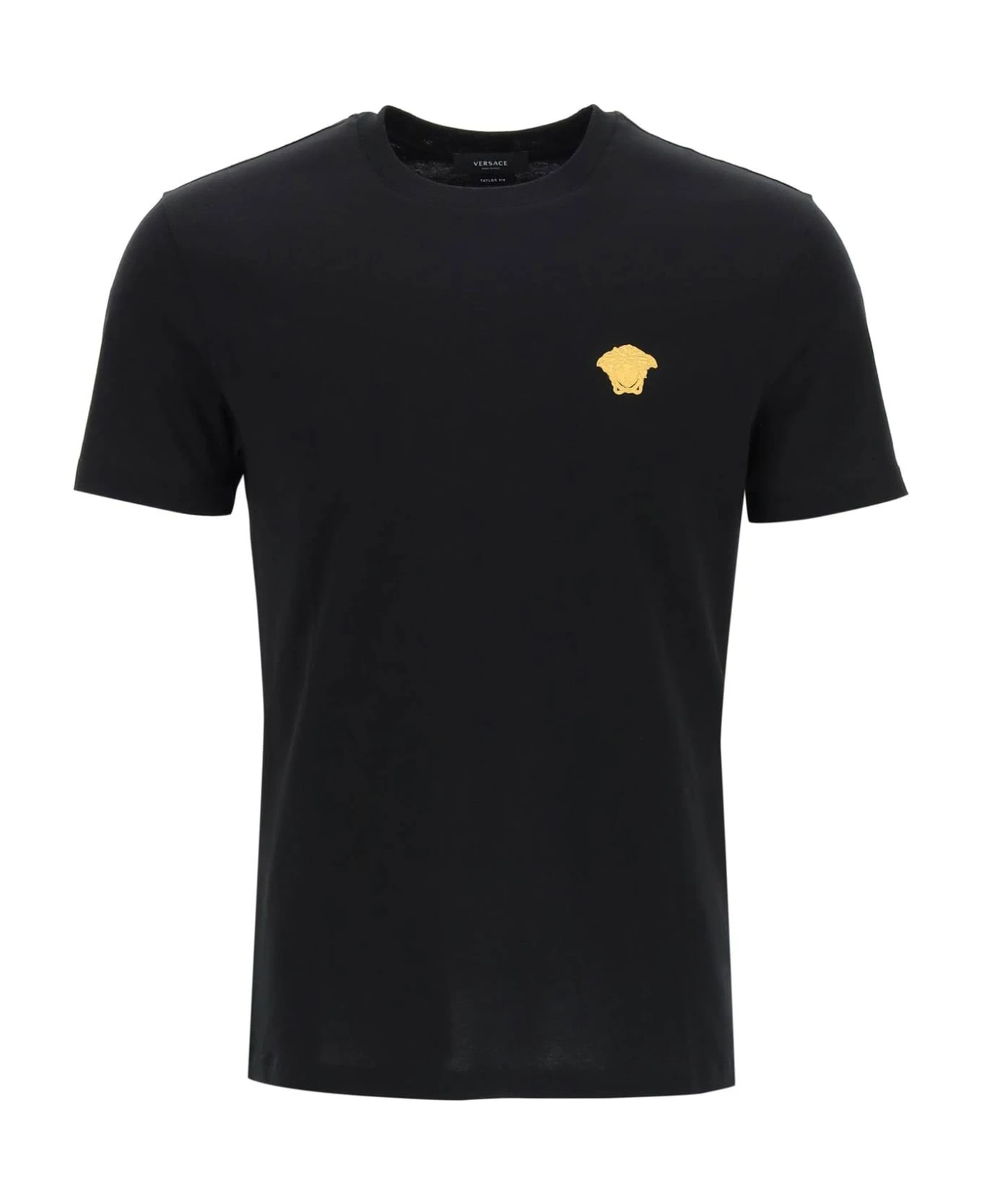 Versace cotton jersey T-shirt embroidered with Medusa logo detail on the chest. Ribbed crew neck. The model is 187 cm tall and wears a size M.