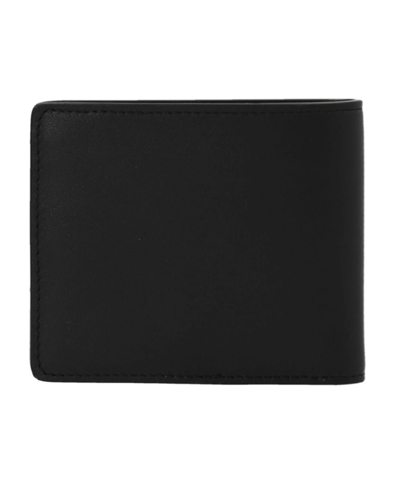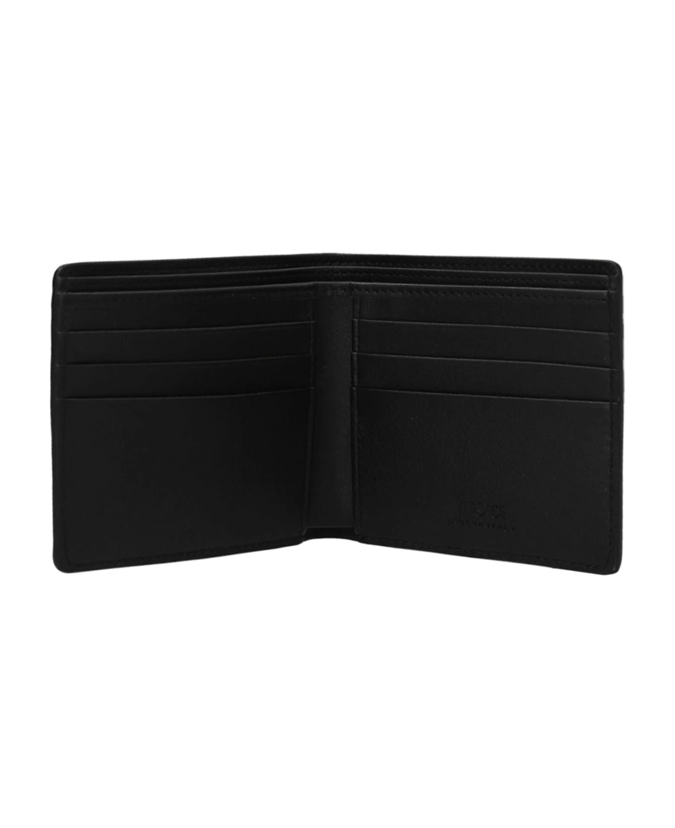 Leather bifold wallet with metallic ‘Medusa’ logo appliqué on the front.