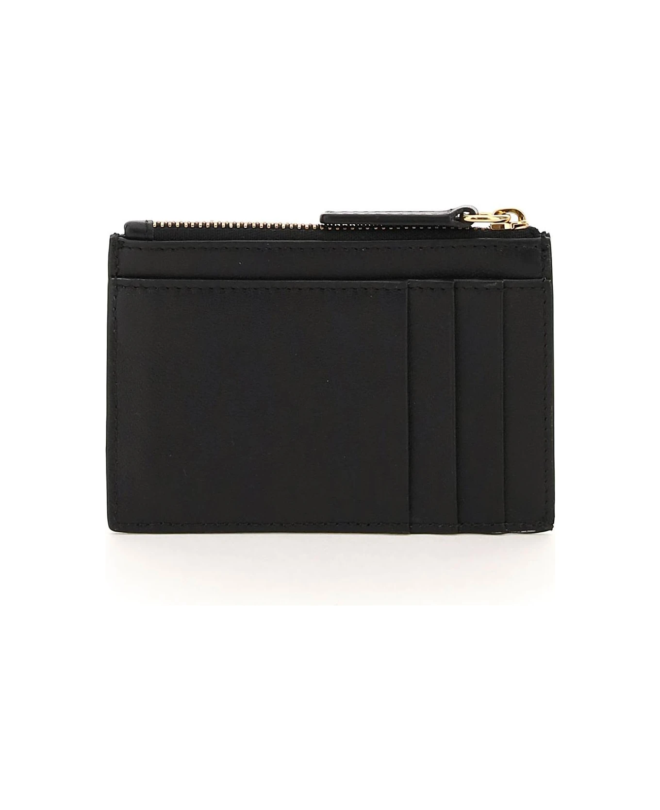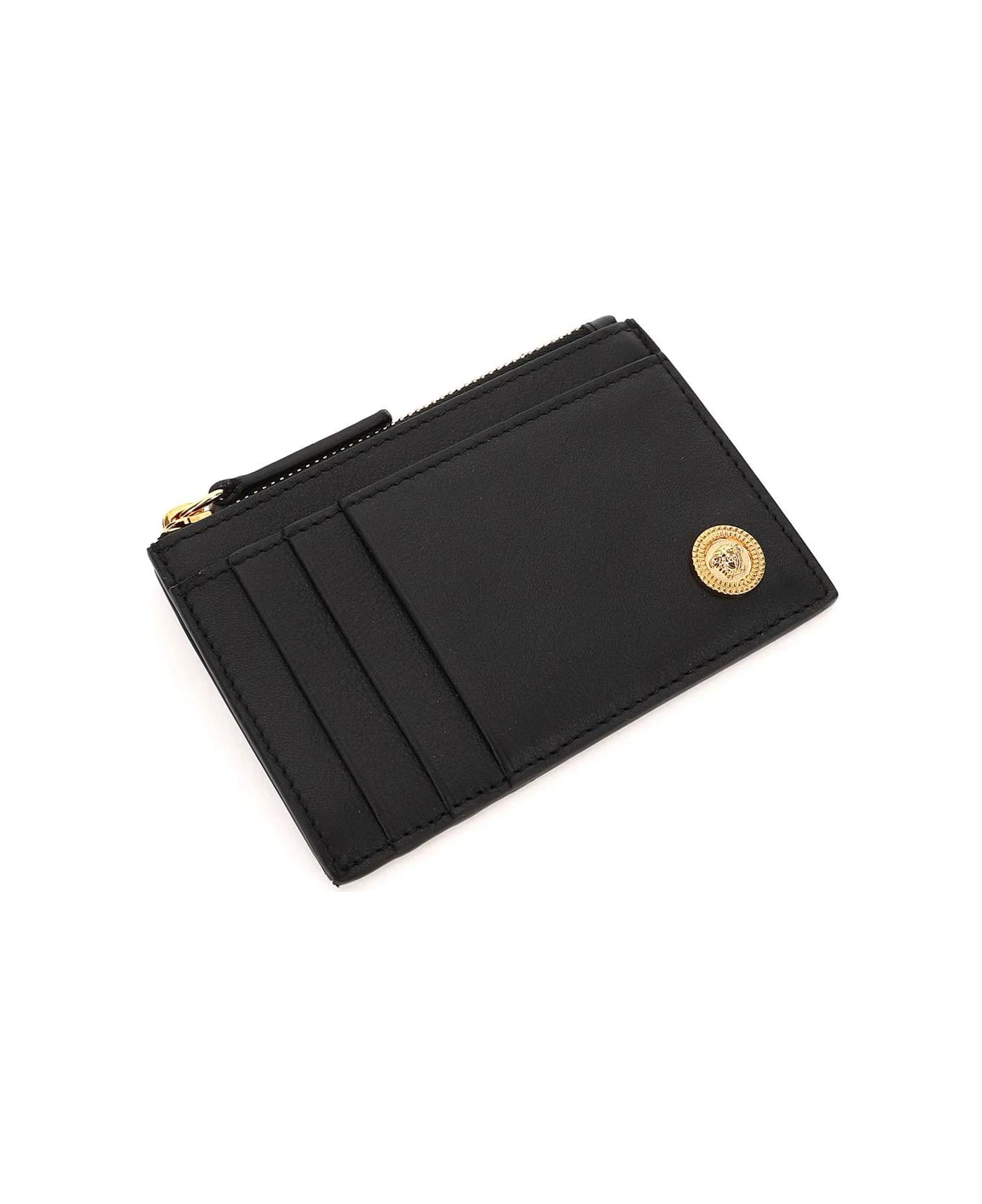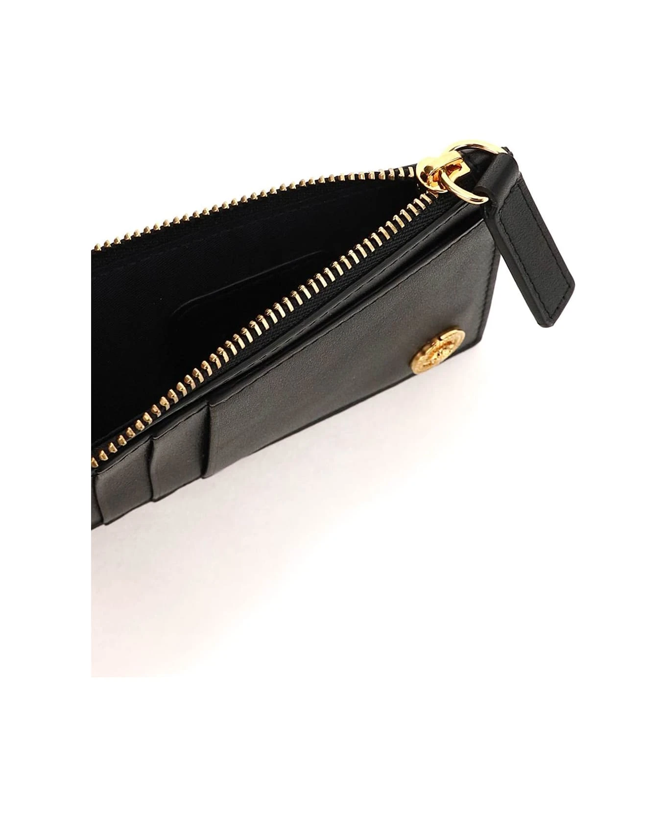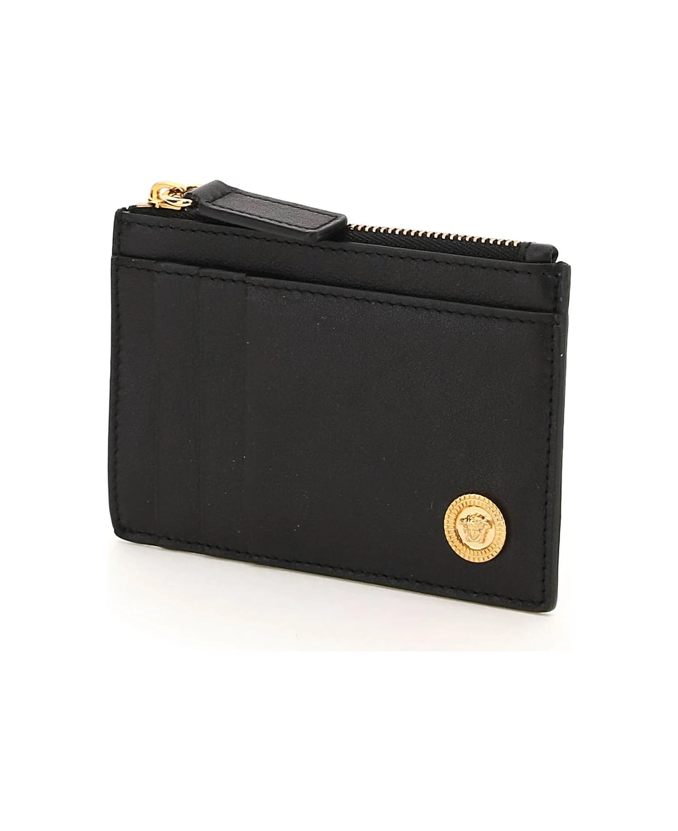 Versace cardholder in smooth leather, characterized by the metal detail with embossed Medusa applied on front. One slit pocket and three credit card slots on each side, middle pocket with zip closure and gusseted side, fabric lining. Gold-finished metalware.