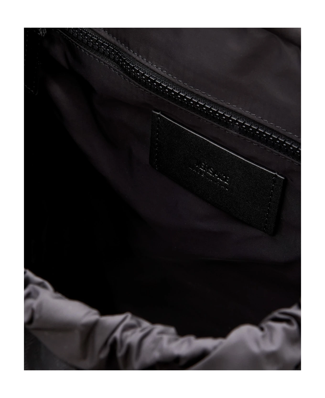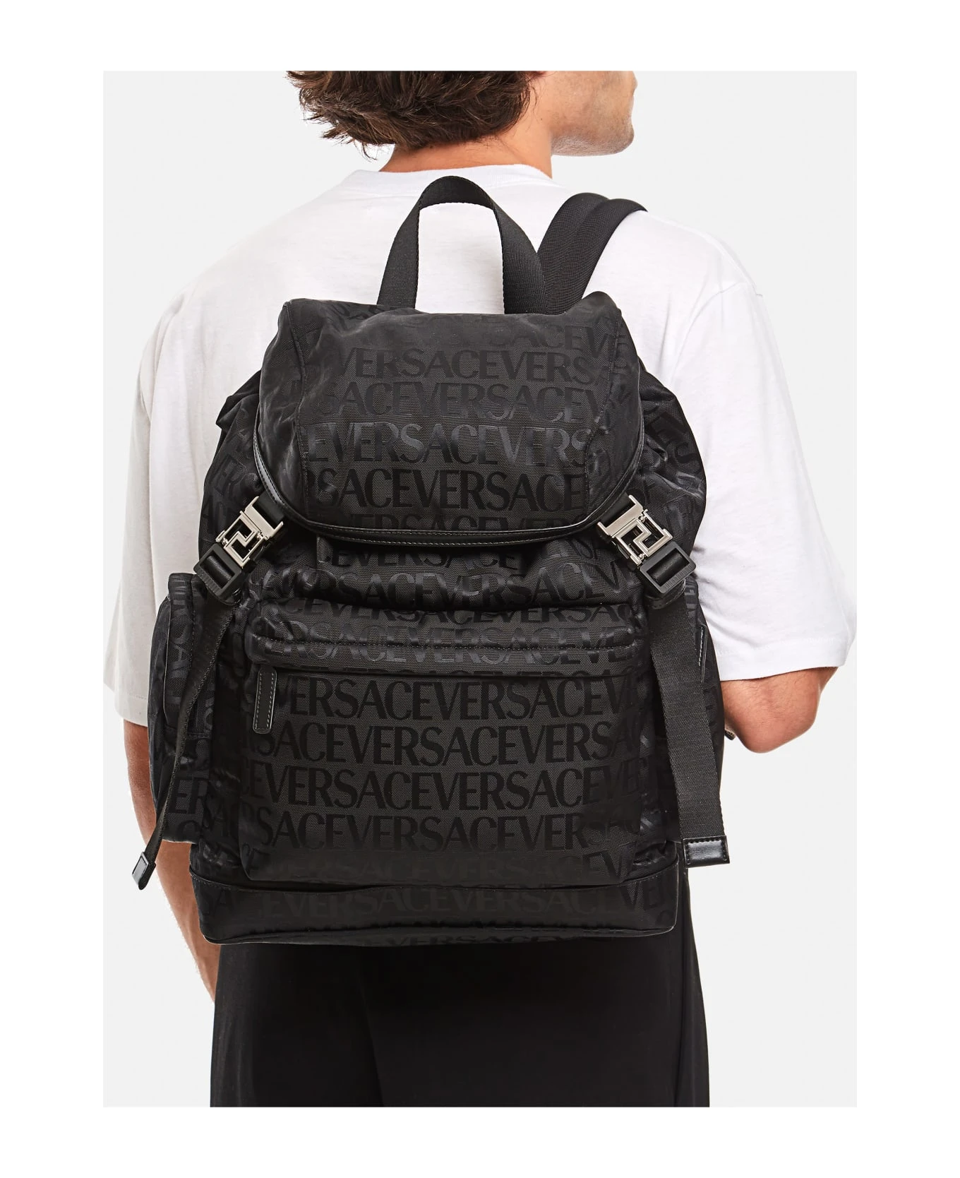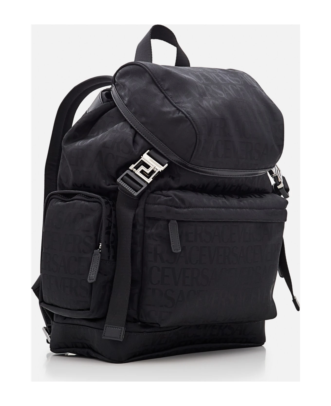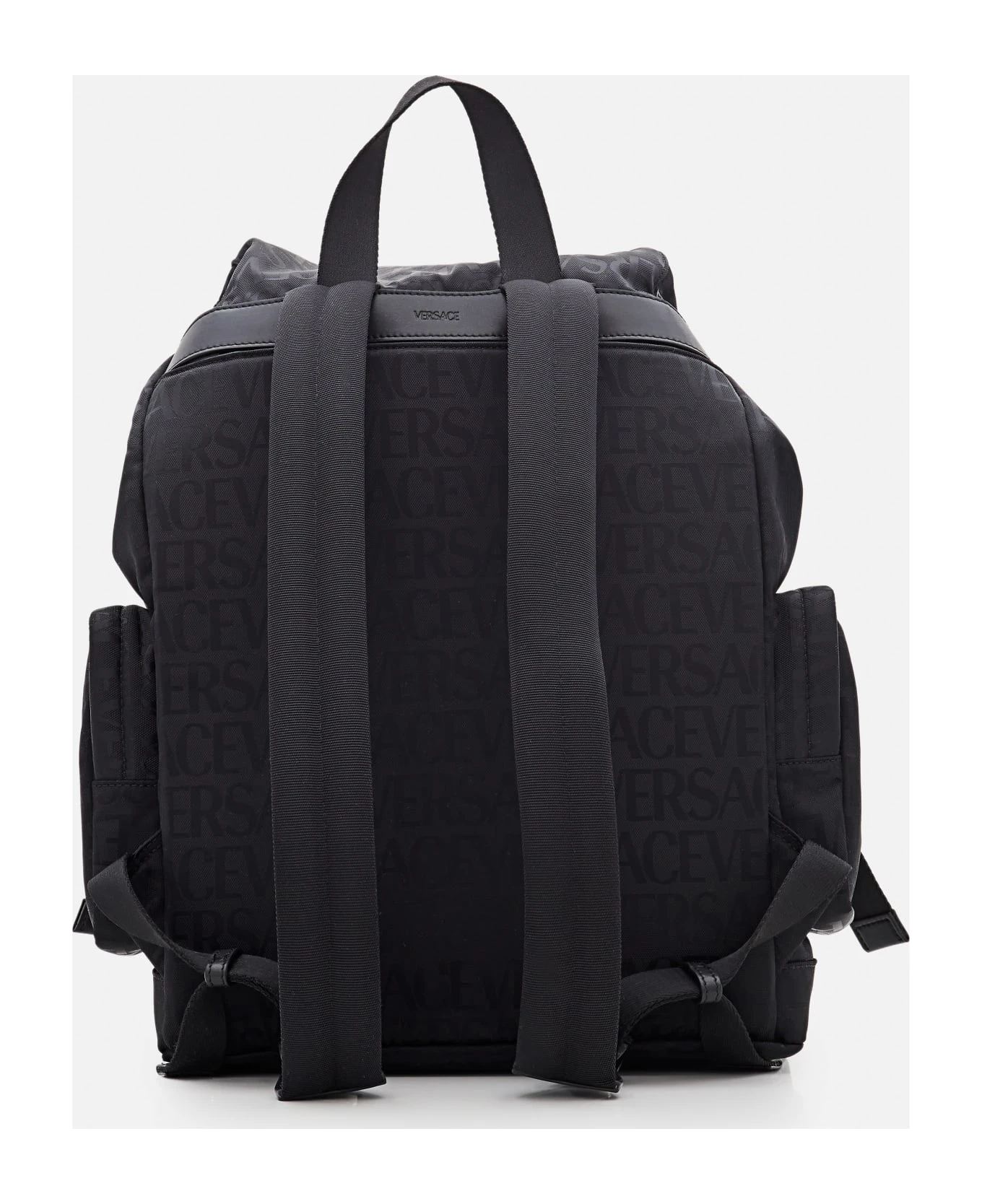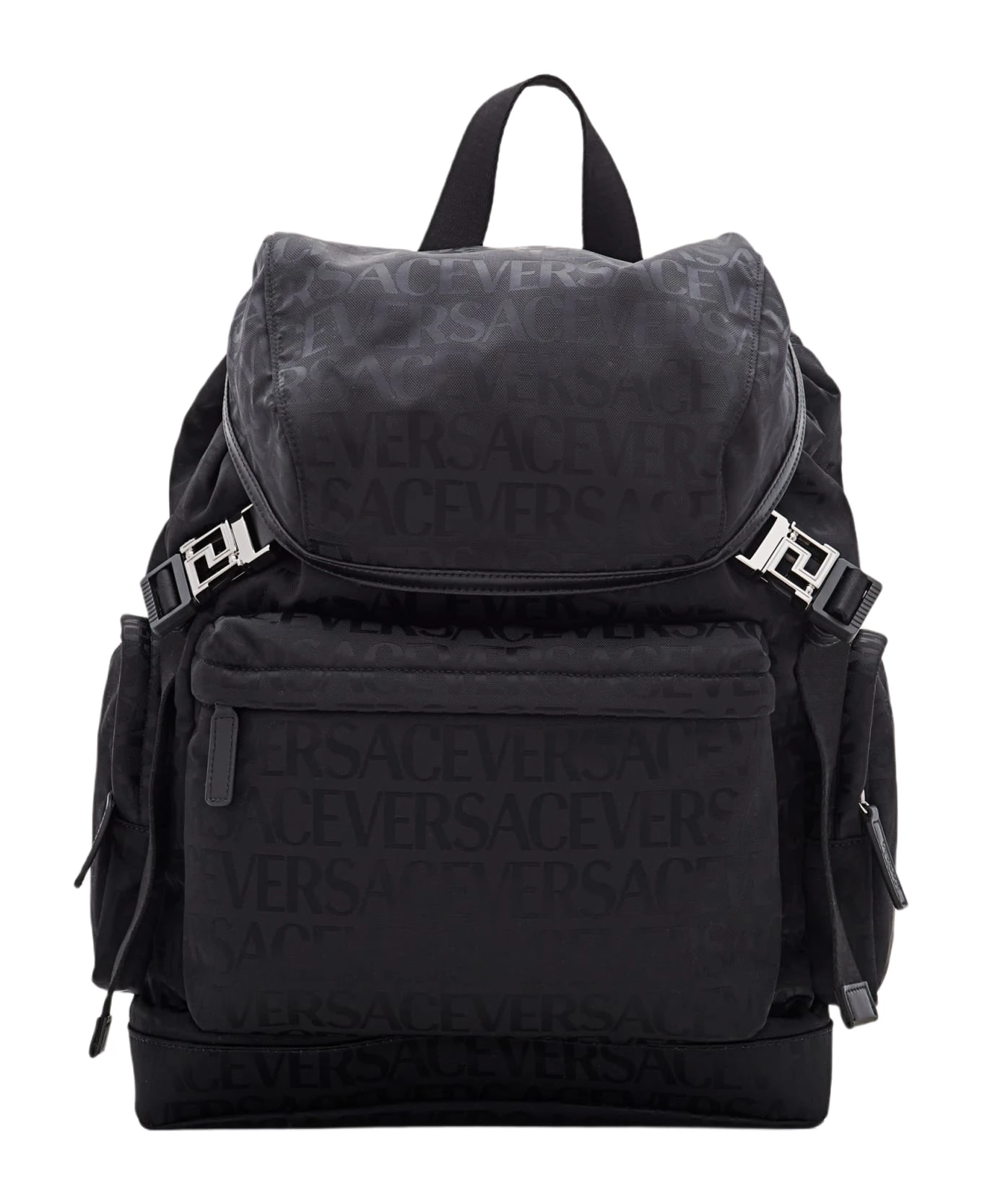 Top handle. Adjustable shoulder straps. Front flap closure. External pouches. Metallic detail. Color: black.