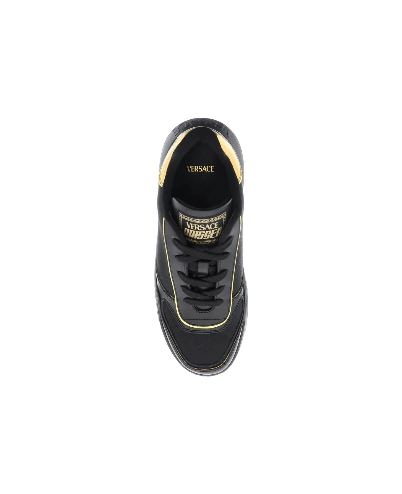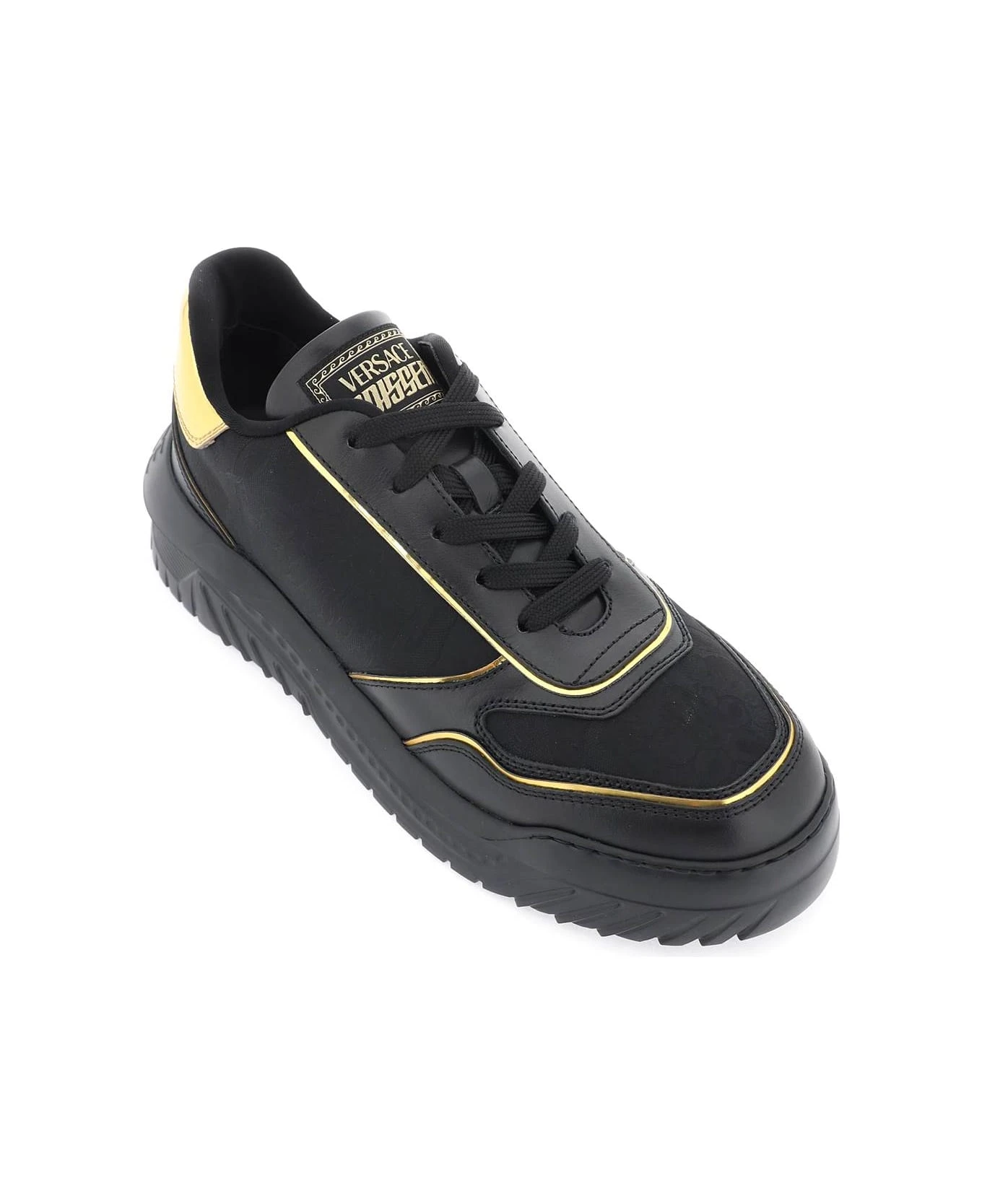 Odyssea sneakers by Versace with upper decorated with jacquard Barocco Silhouette pattern and metallic trim. Logo label on tongue, contrasting logo on the heel tab, rubber insert at back featuring debossed logo. Fabric lining with removable leather insole, rubber sole.