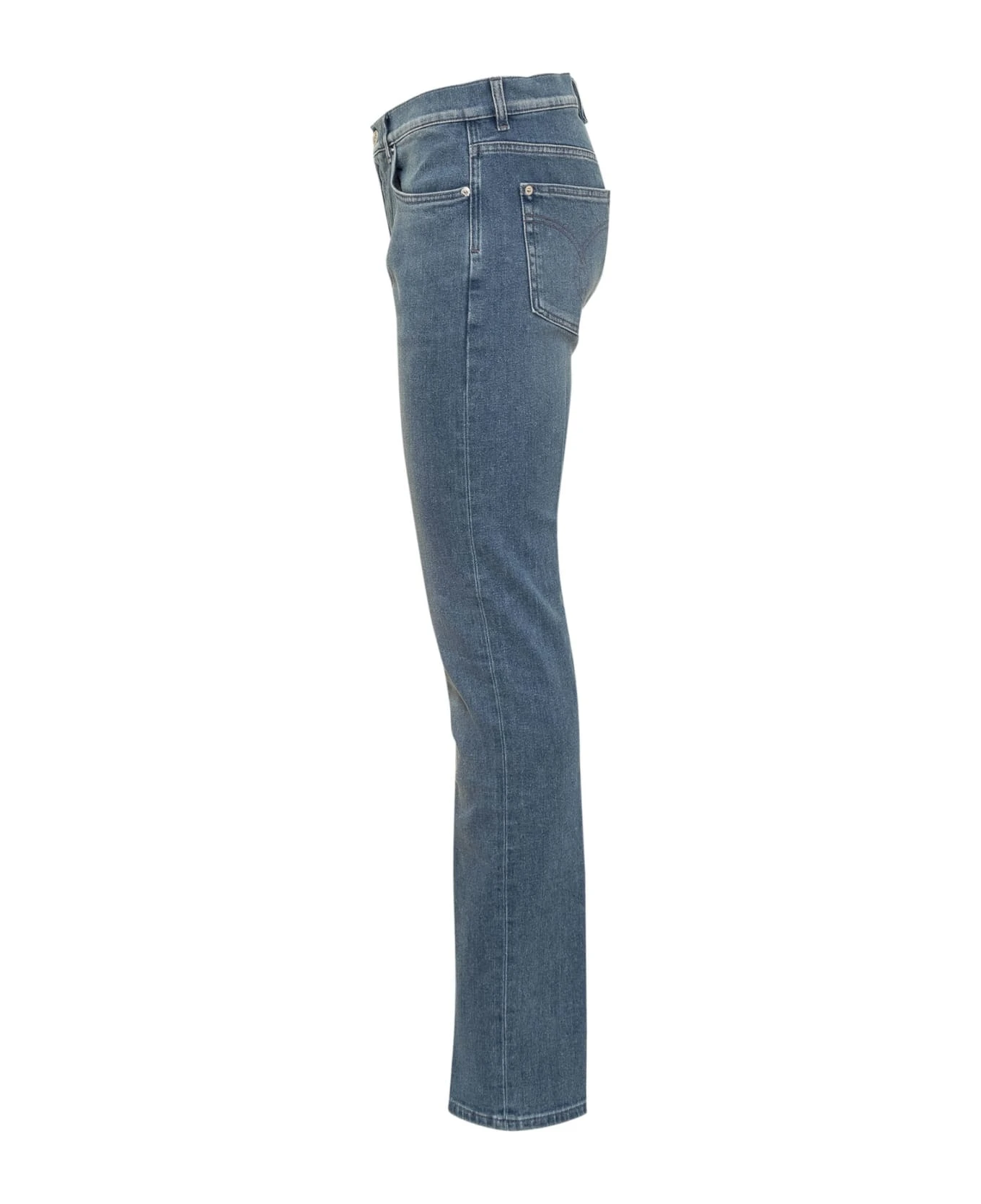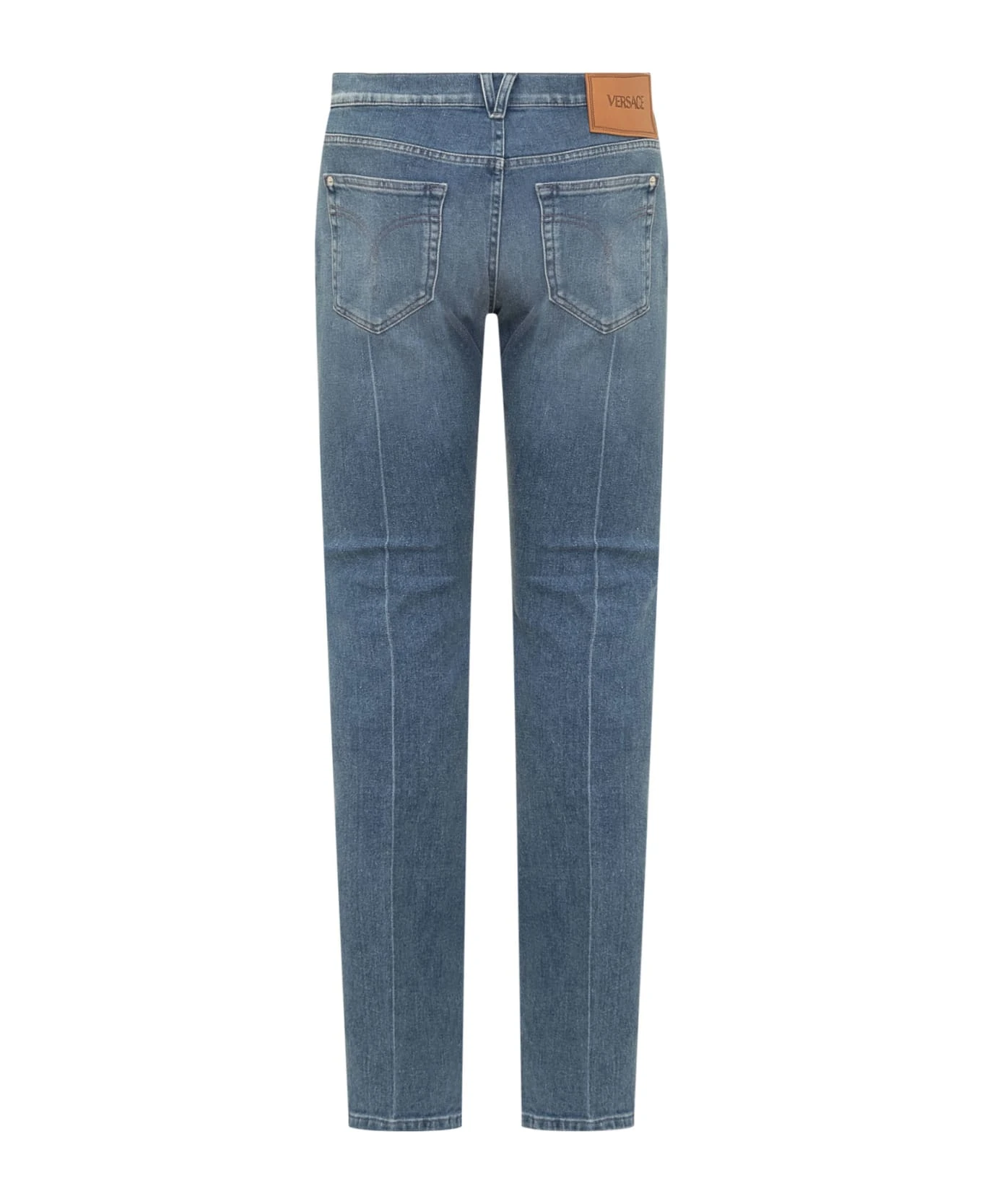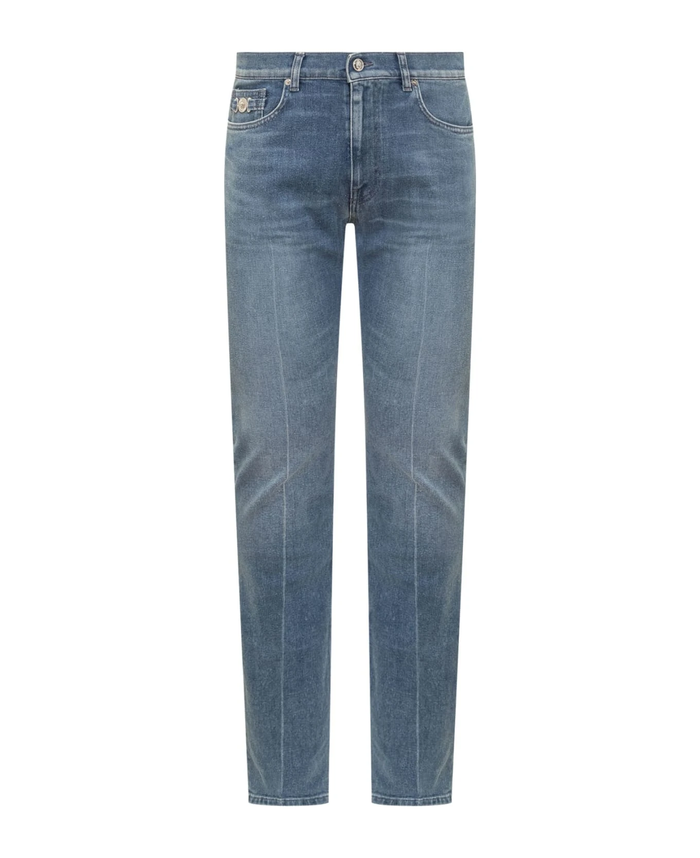 Blue long jeans. Button and zip closure. Logo on the back. Belt loops. 5 pockets. Metal detail with logo.