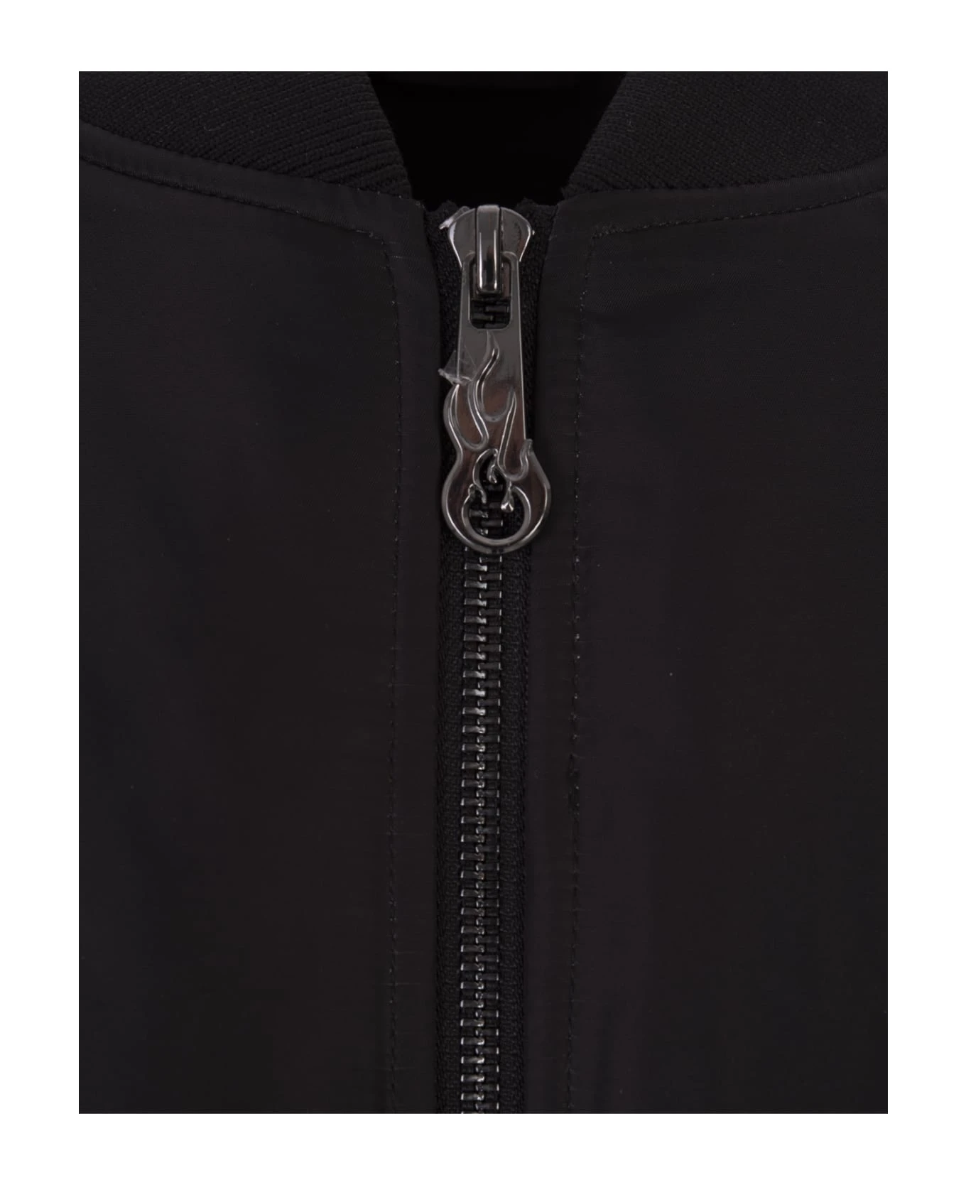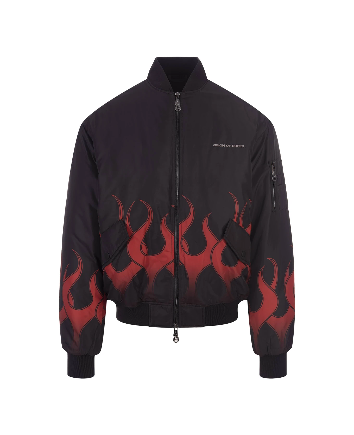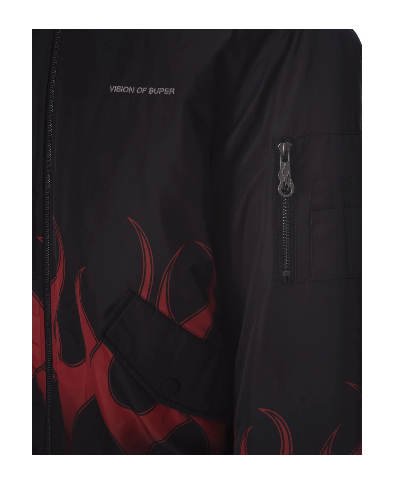 Vision Of Super padded bomber jacket in black nylon with digitally printed red flame graphics. It features ribbed knit trim, flap and button pockets, a contrasting logo on the chest, a pocket on the left sleeve and a practical front fastening with a two-way zip.