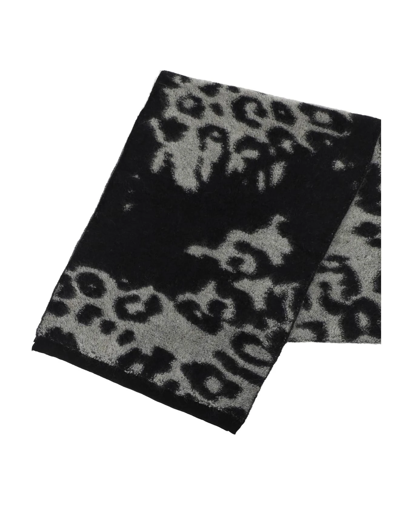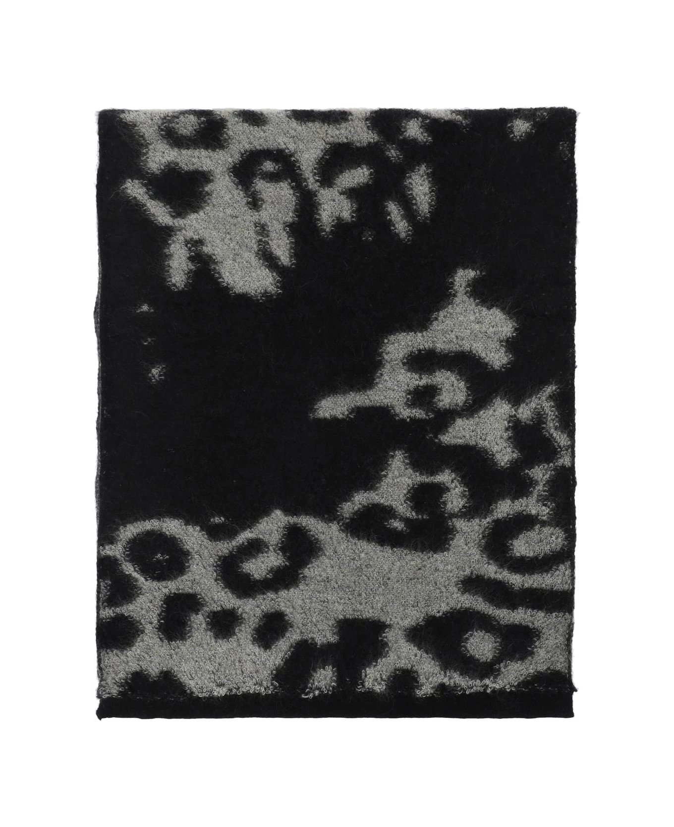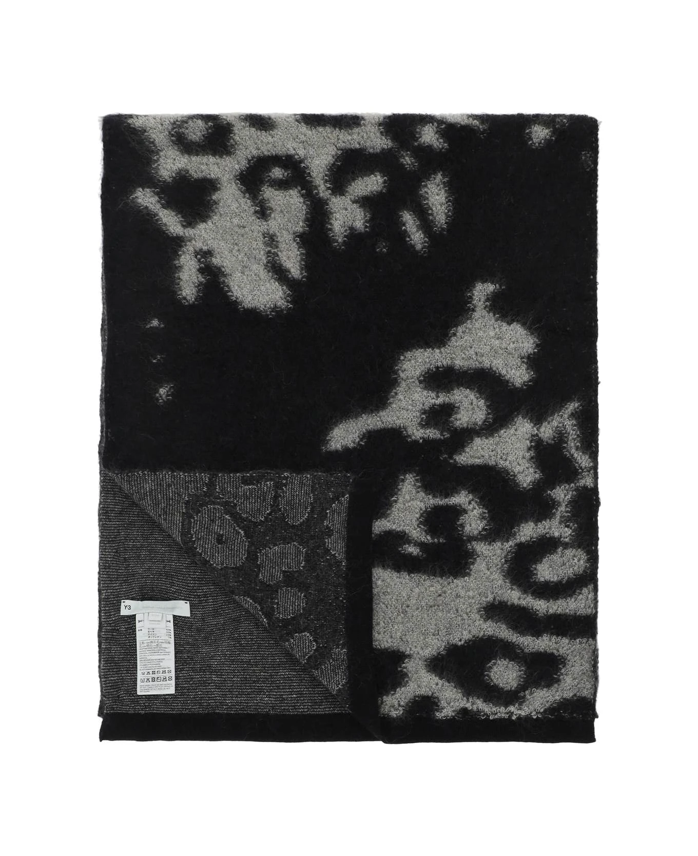 Wool scarf by Y-3 from Adidas’ collaboration with Yohji Yamamoto with animal print and contrasting jacquard lettering logo and micro ribbed edges.